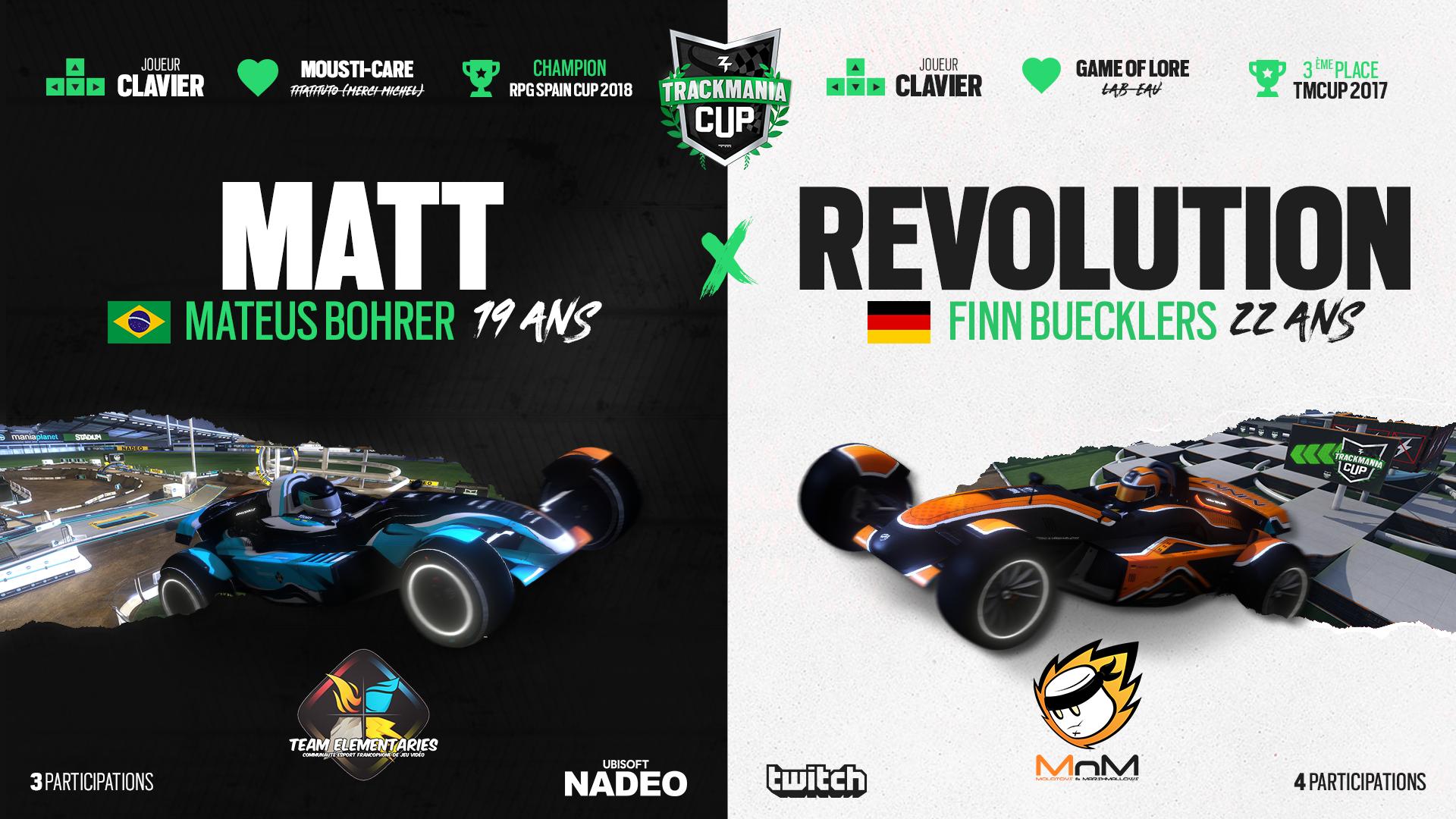 Notre cinquième duo est celui de Mateus "Matt" Bohrer, joueur brésilien de l'équipe Elementaries et vainqueur de la RPG Spain Cup 2018, qui s'était démarqué pour son « o no » au moment de son élimination en quarts de finales l'an dernier, et de Finn "Revolution" Buecklers, troisième de la ZrT Trackmania Cup 2017.