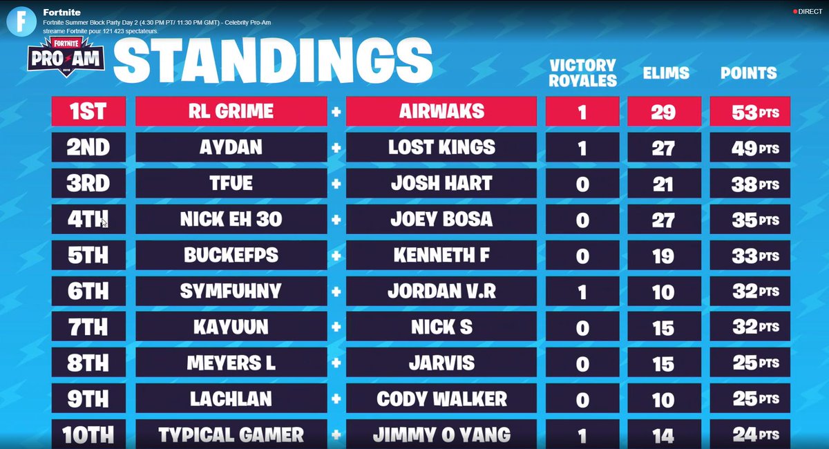 Cette nuit a eu lieu, à Los Angeles et en marge de l'E3, l'édition 2019 du Fortnite Celebrity Pro-Am, un tournoi qui a rassemblé des personnalités du monde du showbiz et des joueurs professionnels. Au terme des 4 manches, c'est le duo composé de Karim "Airwaks" Benghalia (joueur de la formation Solary) et RL Grime (musicien et producteur américain) qui a terminé à la première place avec un total de 53 points, remportant la pioche en or et un million de dollars, une somme qui sera intégralement reversée à l'association choisie par Airwaks : la fondation WWF France.