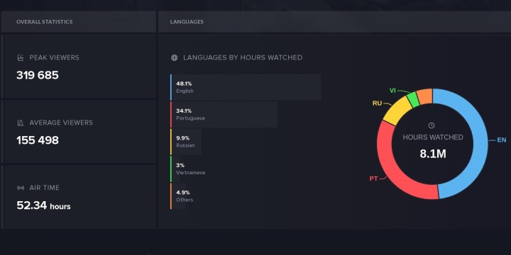 Autre enseignement de cet événement, la croissance continue du nombre de supporters en provenance du Brésil encore et toujours. Car même si l'Anglais reste et demeure en tête, la proportion des suiveurs en Portugais augmente continuellement. L'accumulation des deux langues est d'ailleurs outrageusement majoritaire puisqu'elles représentent à elles deux 82,2% de l'ensemble des heures visionnées par le public. Derrière c'est logiquement le Russe qui arrive avec seulement 9,9% du total des heures vues, suivi par le Vietnamien à 3%. Ne parlons même pas des autres langues qui se partagent les miettes (4,9%), la France luttant aux côtés de l'Allemand, des Suédois et autres Turcs qui tentent de faire vivre leur scène tant bien que mal.