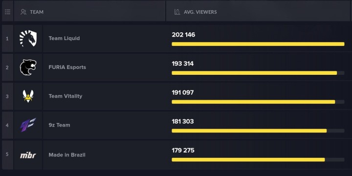 En bref l'événement avait un intérêt certain et le résultat final était loin d'être joué à l'avance. Mais alors comment le public a-t-il réagi face à ce nouveau tournoi d'envergure totalement en ligne ? C'est ce que nous allons tenter d'analyser avec l'aide des résultats fournis par le site Esports Charts.com. Dans un premier temps le match le plus suivi de tout le tournoi aura été celui opposant les Français de la Team Vitality aux Brésiliens de 9z Team. Ceci s'explique par trois raisons :