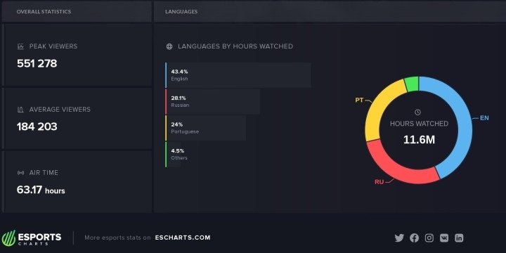 La répartition des nationalités ne laisse d'ailleurs aucun doute, si 43,4% des téléspectateurs se trouvaient sur le stream anglais, ils étaient 28,1% du côté des Russes et 24% chez les Portugais. La situation reste donc inchangée avec une croissance et domination de plus en plus importante des deux zones géographiques totalement opposées mais où le développement de Counter-Strike atteint des niveaux inégalés. La grande finale aura par ailleurs été par moment plus suivie en russe qu'en anglais, ce qui est une première dans ce genre de rendez-vous internationaux. C'est d'ailleurs de ce côté là qu'il fallait s'attarder sur les statistiques, puisqu'à son plus haut le stream russe a réuni 219 000 personnes mais n'est toutefois pas parvenu sur la durée à conserver sa place de leader. Lentement mais surement donc, le russe et le portugais commence à titiller et même, ici, à dépasser l'anglais. Le Flashpoint saison 3 qui se joue actuellement permettra de voir comment se porte le vieux continent lorsqu'il est seul, pendant que l'EPIC CIS League Spring 2021 réservée aux russophones sera également un bon indicateur à observer. En revanche pour le Brésil ce sera plus complexe, une partie des équipes ayant choisi de disputer son tournoi qualificatif pour le Major de fin d'année en Amérique du Nord lors du cs_summit 8, pendant que les autres ont choisi de rester dans leur région et de jouer le CBCS Elite League Saison 1.