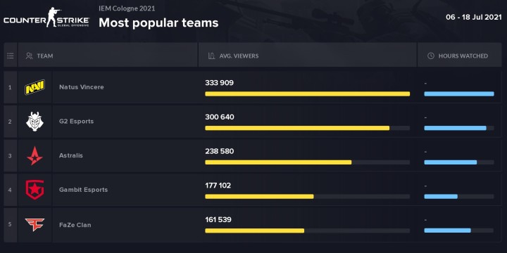 En ce qui concerne les équipes c'est logiquement NAVI (333 909 en moyenne) qui a été la formation la plus suivie, avec derrière G2 Esports (300 640), puis Astralis (238 580), Gambit Esports (177 102) et FaZe Clan (161 539). On remarquera la perte d'une part importante des supporters de FaZe suite au départ de la superstar Marcelo "coldzera" David, ces derniers ont vraisemblablement perdu une bonne partie de leurs supporters brésiliens avec une baisse de plus de 50% de leur suivi par rapport à la BLAST Premier: Spring Groups 2021. Pendant ce temps-là c'est l'inverse chez Gambit qui commence doucement à fidéliser de plus en plus de supporters dans le monde. Le passage du capitaine Vladislav "nafany" Gorshkov dans le show HLTV Confirmed ayant été un grand succès d'audience, sa prestation a certainement joué un rôle important dans cette progression tout comme les récents travaux de la cellule communication du club pour mettre en avant leurs poulains hors de Russie.