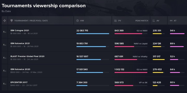 La grande finale opposant les G2 Esports aux Natus Vincere a rassemblé à son maximum 843 369 téléspectateurs en simultanée, et 554 917 en moyenne. Il est à noter tout de même que pour l'occasion l'ESL avait laissé l'Américain, ancien joueur CSGO, Michael "shroud" Grzesiek streamer également sur sa chaîne à partir des demi-finales. Son apport du fait de son incroyable succès sur la plateforme a été non négligeable avec à son pic 94 932 viewers et une moyenne de 58 157 personnes. C'était tout simplement du jamais vu pour l'Electronic Sports League depuis le début de la pandémie. Toutefois le concurrent BLAST a déjà fait mieux dans un domaine statistique et en ligne, preuve que la LAN n'est pas l'explication à tout. En effet lors des finales du BLAST Premier Global Final en 2020 on avait vu 317 017 fans être présents derrière leurs écrans en moyenne lors de chaque match, contre 235 351 aux IEM. Le format est différent lors des finales BLAST, moins étiré et avec plus de spectacle, mais cela n'a pas empêché l'ESL d'être malgré tout meilleure quand on se penche sur les autres secteurs comme le pic qui était de 687 691 au BLAST contre 843 369 aux IEM.