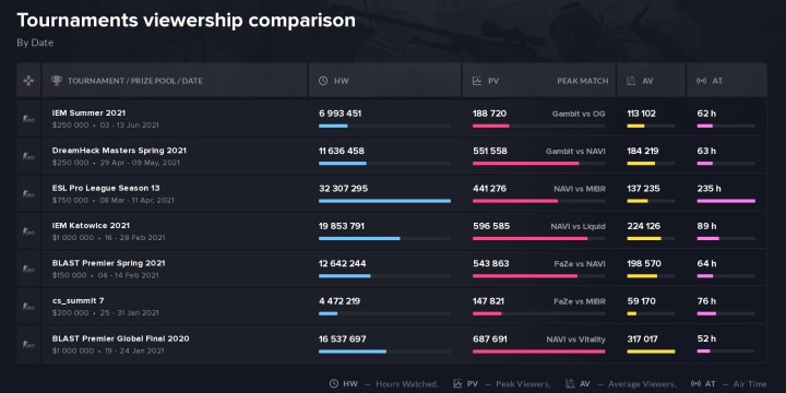 Mais malgré les popularité de nos représentants nationaux, cela n'a pas suffit pour rendre intéressant ces IEM XVI - Summer 2021. Depuis le début de l'année 2021 c'est second tournoi de premier plan le moins suivi. Il faut remonter au mois de janvier 2021 et au cs_summit 7 pour voir des audiences plus faibles. D'ailleurs à titre de comparaison, l'ESL organisait également la DreamHack Masters Spring en mai 2021 et cette dernière, avec un nombre d'heures de diffusion équivalent, a rassemblé en moyenne 70 000 téléspectateurs de plus. Les récentes finales de la BLAST Premier: Spring Finals 2021 devrait réussir à rehausser le niveau, principalement parce qu'elles ont vu de beaux duels entre des formations russophones, notamment la grande finale opposant les Natus Vincere aux Gambit Esports (12-16 Dust2 / 11-16 Mirage). De plus traditionnellement le circuit BLAST rassemble plus de passionnés de Counter-Strike. L'Electronic Sports League devra donc tirer les leçons de cette contre-performance, son championnat étant moins apprécié, peut-être aussi moins lisible, et il aura pêché par son absence de grande confrontation entre formations brésiliennes (absentes) et russophones (elles ne se sont jamais croisées sauf en poule le duel entre la Team Spirit et les Virtus.pro). Autre comparaison qu'il est possible de faire avec la DreamHack Masters Spring, le nombre d'heures passées à regarder le show qui s'élève à seulement 6 993 451 heures pour ces IEM Summer, contre presque le double lors de la DreamHack (11 636 458 heures).
