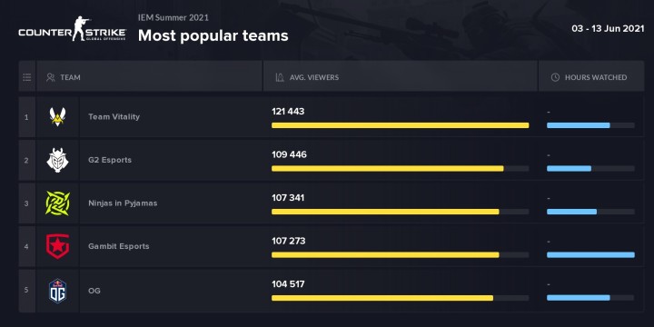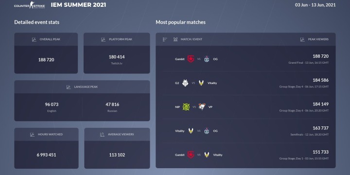 Première chose à retenir, en comparaison avec les autres événements de la saison 2021 ces IEM XVI - Summer 2021 ont réalisé des scores assez faibles, pour ne pas dire médiocres. Le match le plus suivi n'a en effet rassemblé que 188 720 spectateurs à son maximum, il s'agissait assez logiquement de la grande finale opposant les Gambit Esports aux OG (16-14 Mirage / 16-11 Dust2 / 16-07 Overpass). Ensuite on retrouve à la seconde place le duel, sorte de derby pour les Français, mettant aux prises la Team Vitality aux G2 Esports en phase de poule du tournoi (17-19 Dust2 / 16-09 Mirage / 10-16 Overpass). Cette rencontre aura réussi à rassembler presque autant que la grande finale avec 184 586 téléspectateurs à son plus haut. Pour compléter ce podium, c'est une fois de plus un duel qui s'est joué pendant les poules qui récupère la médaille de bronze de l'intérêt du public. Il voyait s'affronter les joueurs de chez Ninjas in Pyjamas à ceux de Virtus.pro (16-14 Mirage / 11-16 Inferno / 04-16 Overpass) et il y aura eu 184 149 personnes au maximum qui auront suivi cette confrontation. Derrière c'est la chute puisque plus aucune audience ne dépassera la barre des 165 000 téléspectateurs. Comme souvent en revanche, on peut constater que les tricolores de la Team Vitality sont les plus populaires puisqu'ils parviennent à se classer à trois reprises dans le top 5 des affrontements les plus suivis. La popularité de l'abeille se confirme donc, et cela malgré des résultats décevants depuis le début de l'année.