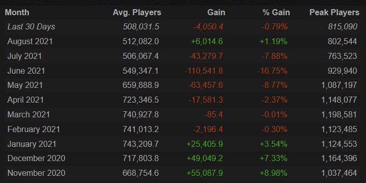 Les statistiques du nombre de joueurs sur Counter-Strike: Global Offensive sont reparties à la hausse au mois d'août 2021, cela faisait suite à six mois de baisse continue depuis le mois de février. Pendant ce temps, sur Twitch le titre reste assez stable malgré les vacances de la scène compétitive.
