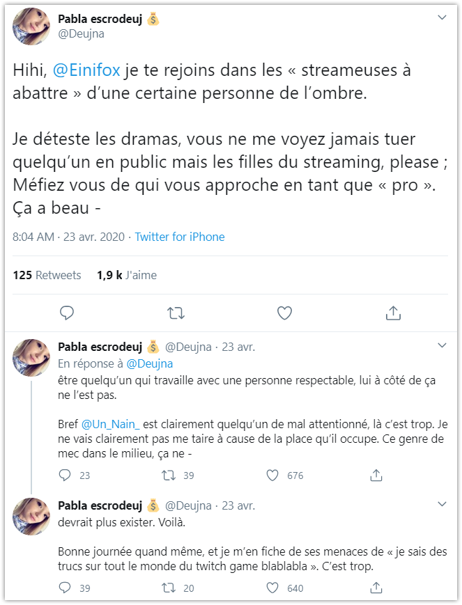 C'est Deujna, streameuse / youtubeuse avec 940 000 abonnés, qui a mis un gros coup de pied dans la fourmillière avec cette série de tweets :