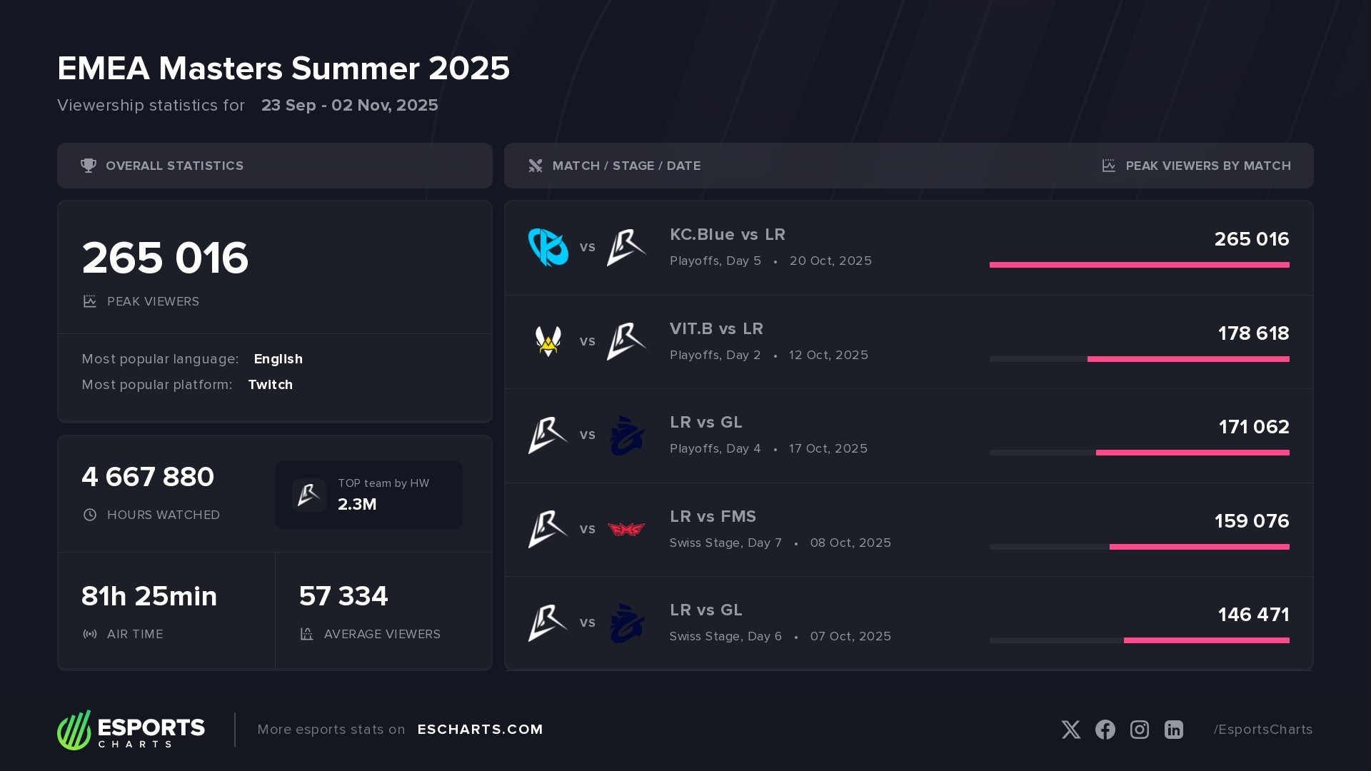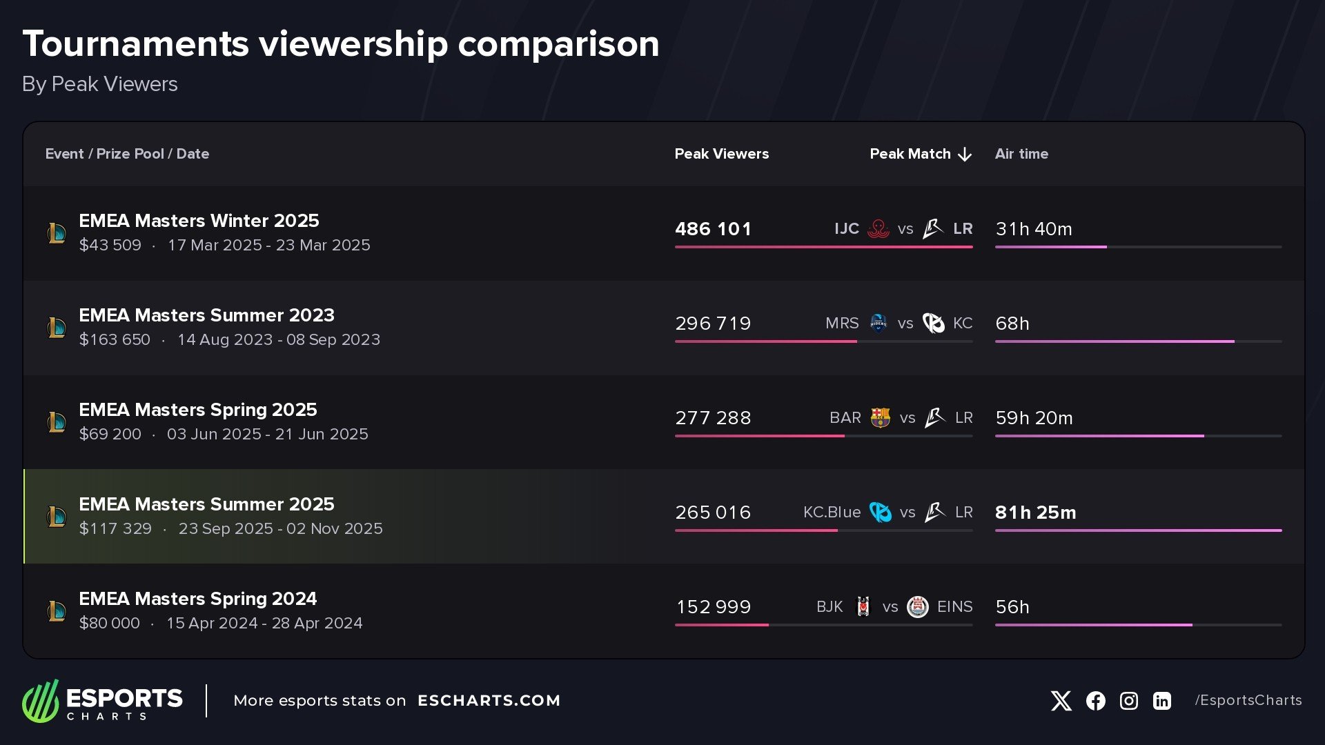 Malgré cette baisse, Esports Charts classe les EMEA Masters Summer 2025 au quatrième rang des éditions les plus suivies depuis le changement de format et de nom du tournoi. Le Winter 2025, porté par l’explosion de Los Ratones et un calendrier plus dégagé, conserve son statut d’édition la plus populaire, avec un pic supérieur à 486 000 spectateurs.