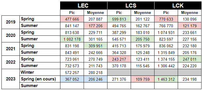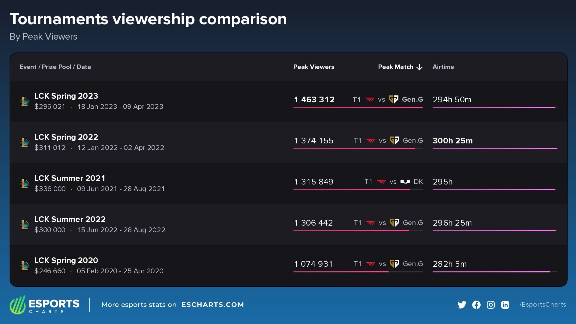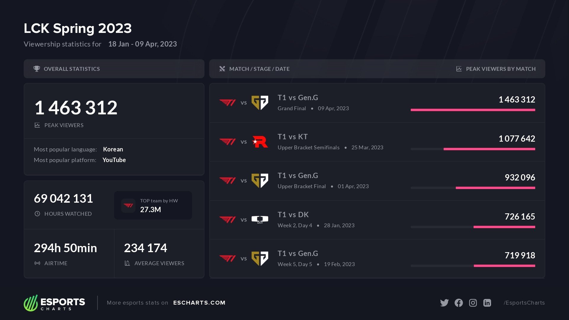 En attendant, profitons de ce moment d'accalmie pour faire un point sur l'audience de la ligue coréenne, et plus particulièrement sur cette finale. Sans grande surprise, le BO5 entre T1 et Gen.G est la rencontre qui a enregistré le meilleur pic d'audience de tout le Spring Split ; d'après les données fournies par Esports Charts, ce match a enregistré un pic à 1 463 312 spectateurs, devenant ainsi la rencontre la plus regardée de cette saison 2023, devant le Bo5 Round 2 entre T1 vs KT Rolster qui a eu lieu deux semaines auparavant. Cette rencontre qui est venue clôturer ce segment printanier 2023 est donc la plus populaire dans ce Spring Split, mais elle est également la plus populaire dans l'histoire de la LCK, battant le record enregistré au Spring Split 2022 (finale entre T1 et Gen.G) de plus de 100 000 viewers. On peut également noter que l'événement coréen rassemble plus d'un million de téléspectateurs sur les services de streaming pour la deuxième année consécutive.