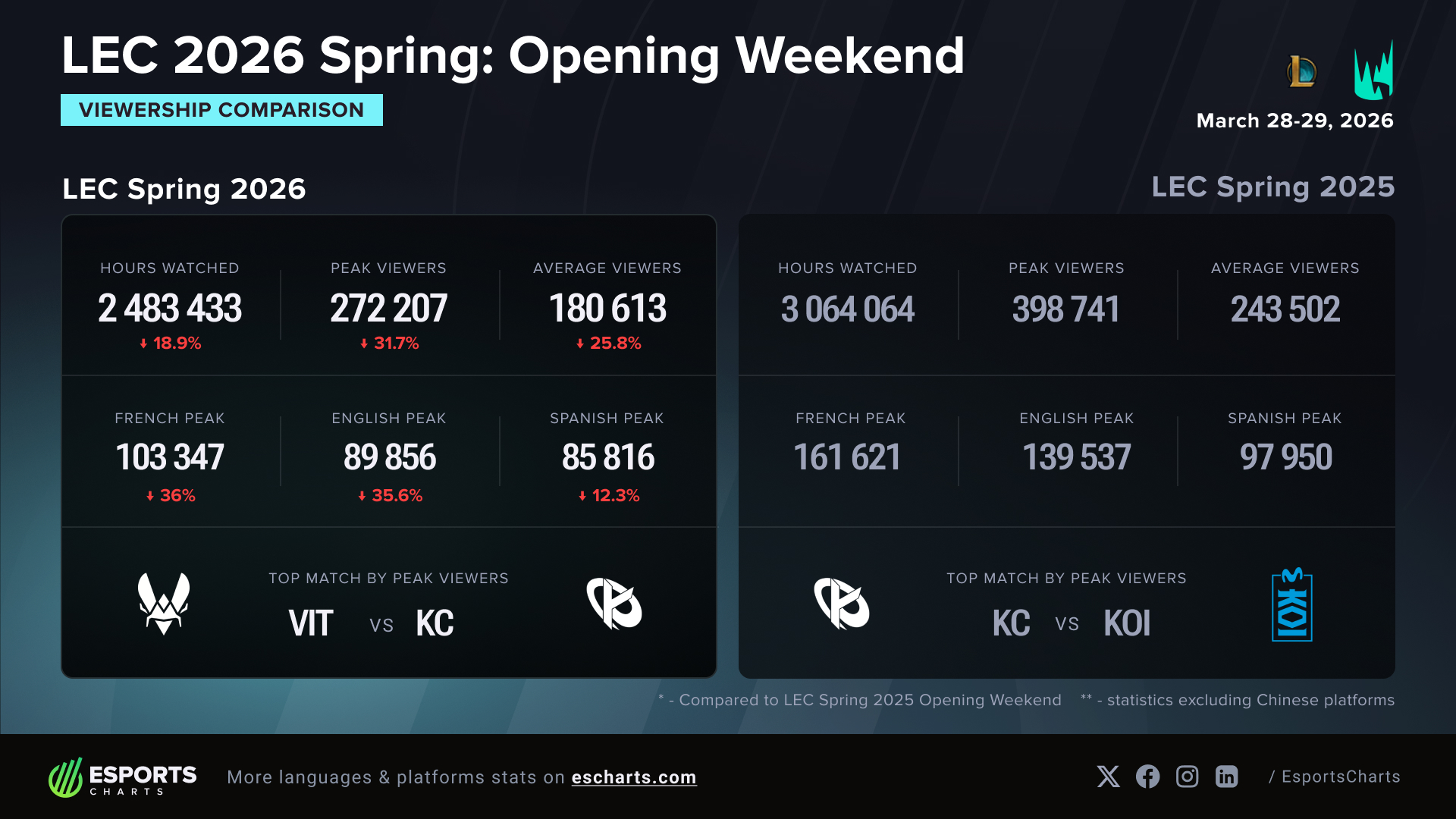 D'après Esports Charts, deux raisons majeures peuvent plus ou moins expliquer cette chute. La première serait du à l'absence de la structure Los Ratones. L'équipe avait ramené un public anglophone massif au Winter Split et boosté les statistiques globales. Son départ laisse un énorme vide que les équipes habituelles n'arrivent pas à combler. Le calendrier a aussi joué un rôle clé. Le LEC a fait l'impasse sur G2 Esports (et accéssoirement Shifters) pour cette première semaine, les champions du monde en titre benefissiant d'une semaine de vacances supplémentaire suite à leur participation au First Stand. Depuis plusieurs saisons, G2 reste le plus gros moteur de viewership de la ligue et son absence fait mécaniquement plonger les moyennes. Un rebond est logiquement attendu avec le retour de ces équipes la semaine prochaine, mais le LEC va devoir prouver qu'il peut maintenir des audiences solides sur la durée sans dépendre d'une seule équipe, comme G2, ou d'un phénomène éphémère, comme Los Ratones.