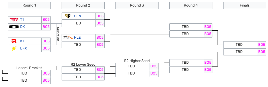 Toutes les rencontres se joueront en Bo5 au format Fearless Draft, comme déjà utilisé lors du Play-In.