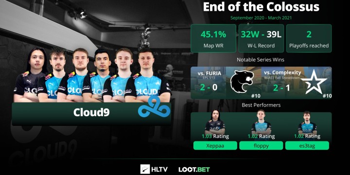 Eh bien non en fait, 6 mois plus tard l'organisation annonce qu'elle fait une pause sur Counter-Strike: Global Offensive, tous les joueurs sont placés sur la liste des transferts et les résultats auront été plus que médiocres. Ce sera même moins bien qu'avant toutes ces dépenses. Aucun titre remporté, au mieux des top 8 lors de la DreamHack Masters Winter 2020: Europe ou le cs_summit 7. Et puis surtout la débandade lors de l'Intel Extreme Masters XV - World Championship avec une défaite d'entrée de jeu contre la Team Spirit (07-16 Inferno), puis une seule victoire compliquée dans le loser bracket lors du match contre les Movistar Riders (16-11 Overpass / 19-16 Nuke) et puis une élimination au tour suivant face à des OG eux aussi en pleine crise (08-16 Nuke /16-11 Overpass / 16-12 Dust2). Le sommet de cette désillusion collective aura lieu lors de l'ESL Pro League saison 13 où les Cloud9 termineront avant-derniers de la poule C avec un bilan de 2 victoires pour 3 défaites. Mais les dés étaient déjà jetés, l'équipe se savait en sursis or dans ces conditions il est bien difficile d'être à la hauteur face au gratin mondial.