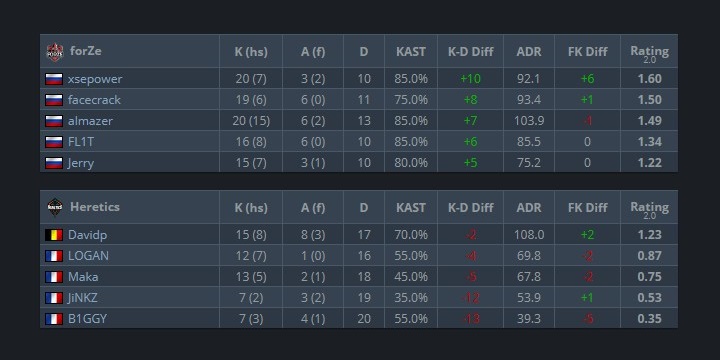 Les statistiques détaillées du match Heretics vs. forZe sur Dust2 (c) HLTV