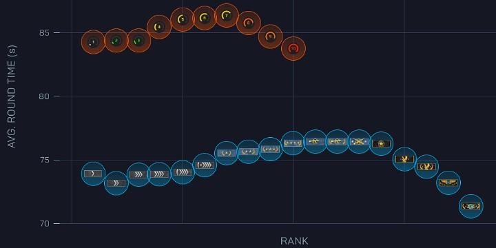 On constate donc que les joueurs possédant le rang le plus faible sur Counter-Strike: Global Offensive ont plus tendance à jouer des parties courtes, cela s'explique par l'absence de stratégie différente du fameux « Rush B » dit avec conviction dans un accent russe symptomatique de cette tactique. Mais ce n'est pas tout, en compétitif officiel on constate un différentiel beaucoup plus important qu'en FACEIT, cela s'explique notamment par le fait qu'un grand nombre de joueurs choisissent tout simplement d'abandonner et/ou de quitter les serveurs officiels, et que cela arrive beaucoup moins en FACEIT.