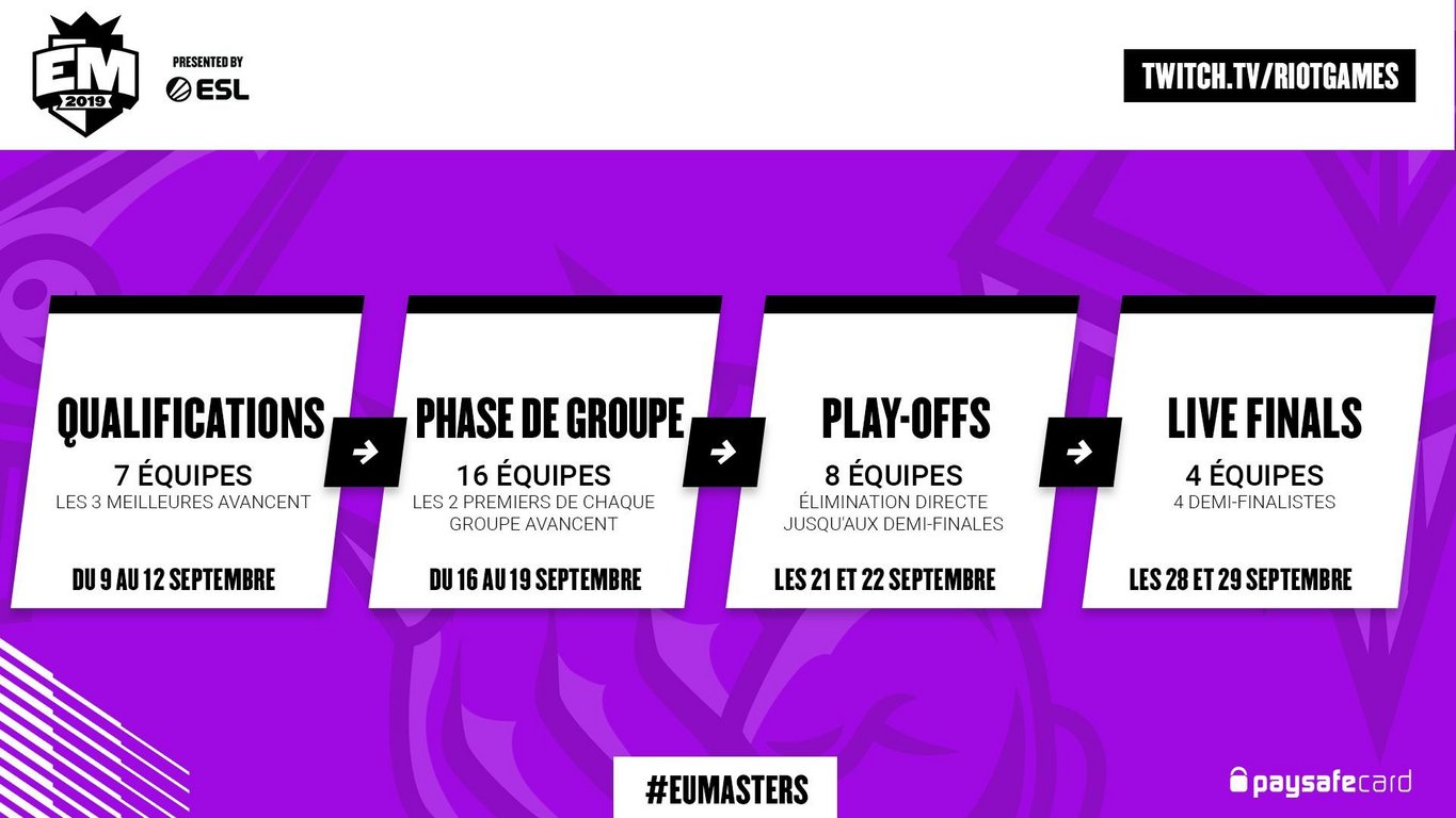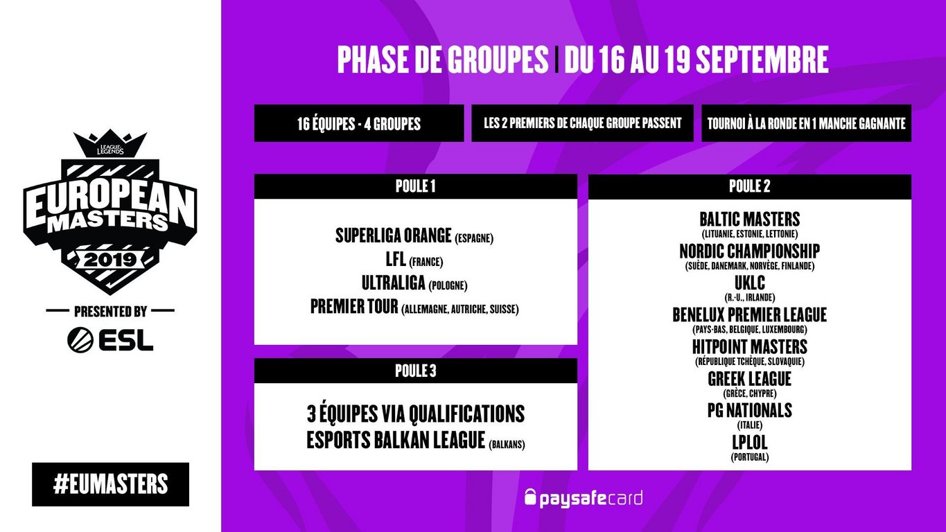 - La phase de groupes du Main Event aura lieu du 16 au 19 septembre. Il réunira les 13 champions des ligues régionales + les 3 meilleures équipes des qualifications.