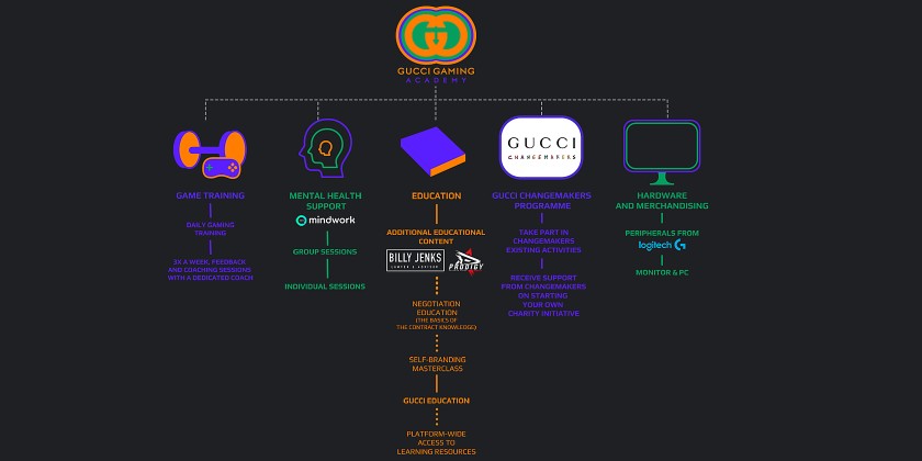 La Gucci Gaming Academy fournira aux joueurs des conseils en matière de santé mentale, des réseaux de formation, un coaching et une assistance matérielle. Elle a pour but de servir d'étape vers une carrière professionnelle pour ceux qui n'ont pas encore été détectés ou recrutés. L'académie a déjà sélectionné plusieurs prospects dans son programme, on retrouve notamment EspiranTo qui est déjà bien connu et se démarque dans cette liste comme étant le joueur le plus expérimenté.