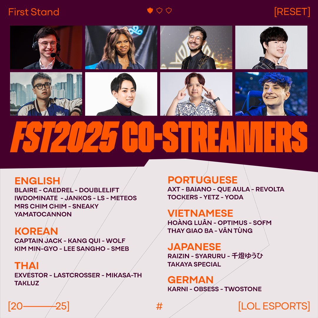 Il y aura à nouveau du co-streaming au First Stand 2025. Les fans pourront profiter du spectacle aux côtés de leurs créateurs favoris. Cette année, Riot Games propose cette expérience sur un 3e événement mondial, avec plus de 75 co-streamers à chaque match. En plus de la diffusion principale, les spectateurs auront l'embarras du choix pour suivre l'action. Riot Games a proposé à toutes les équipes professionnelles qualifiées d'animer des co-streams tout au long du tournoi, pour offrir une meilleure expérience de visionnage à leur communauté.