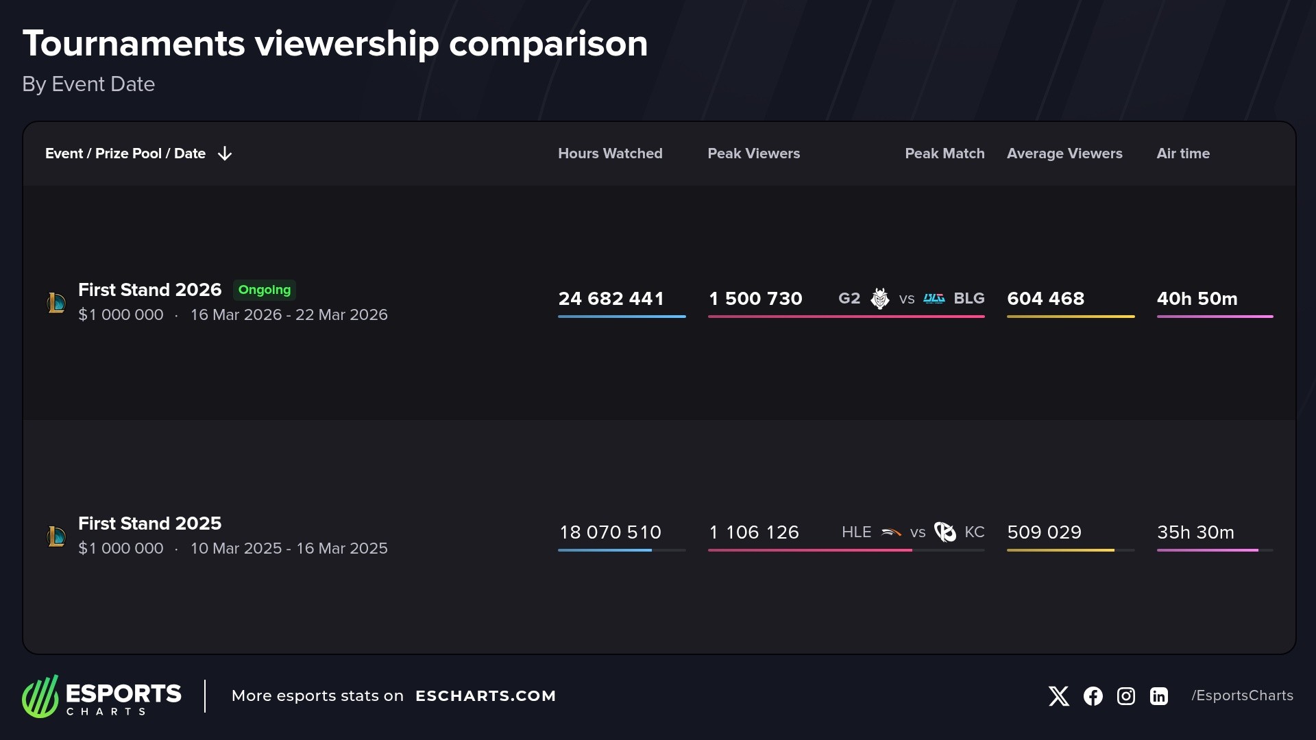 Cet affrontement sino-européen a suscité un fort intérêt sur les différentes plateformes de diffusion. Selon les données communiquées par Esports Charts, la grande finale a réuni un pic de 1 500 730 spectateurs en simultané. Ce chiffre confirme l'attractivité grandissante du First Stand et affiche une croissance nette des audiences. Il représente en effet une augmentation d'environ 400 000 spectateurs en pic par rapport à l'édition 2025 remportée par Hanwha Life Esports après s'être imposé en finale face à la Karmine Corp, soit une augementation de 35%.
