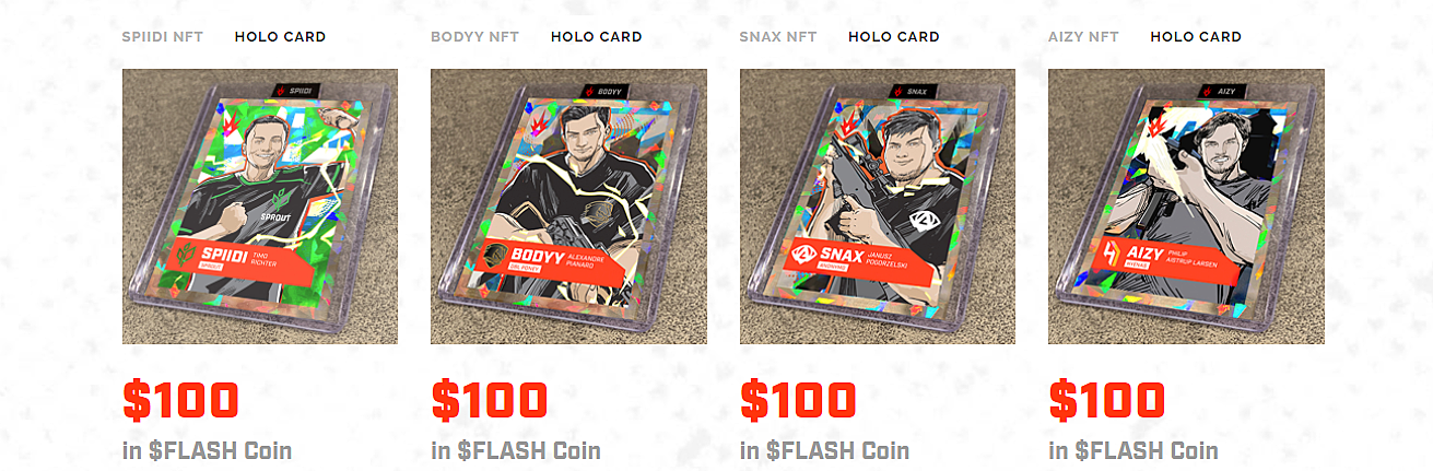Flashpoint lance, lors de cette initiative, ses packs de NFT et de cartes à l’effigie de joueurs participant à l’événement en cours, Flashpoint 3. Vous pourrez y retrouver des œuvres à l’effigie de joueurs tels que Janusz « Snax » Pogorzelski, Philip « aizy » Aistrup Larsen, Martin « STYKO » Styk et Alexandre « bodyy » Pianaro.