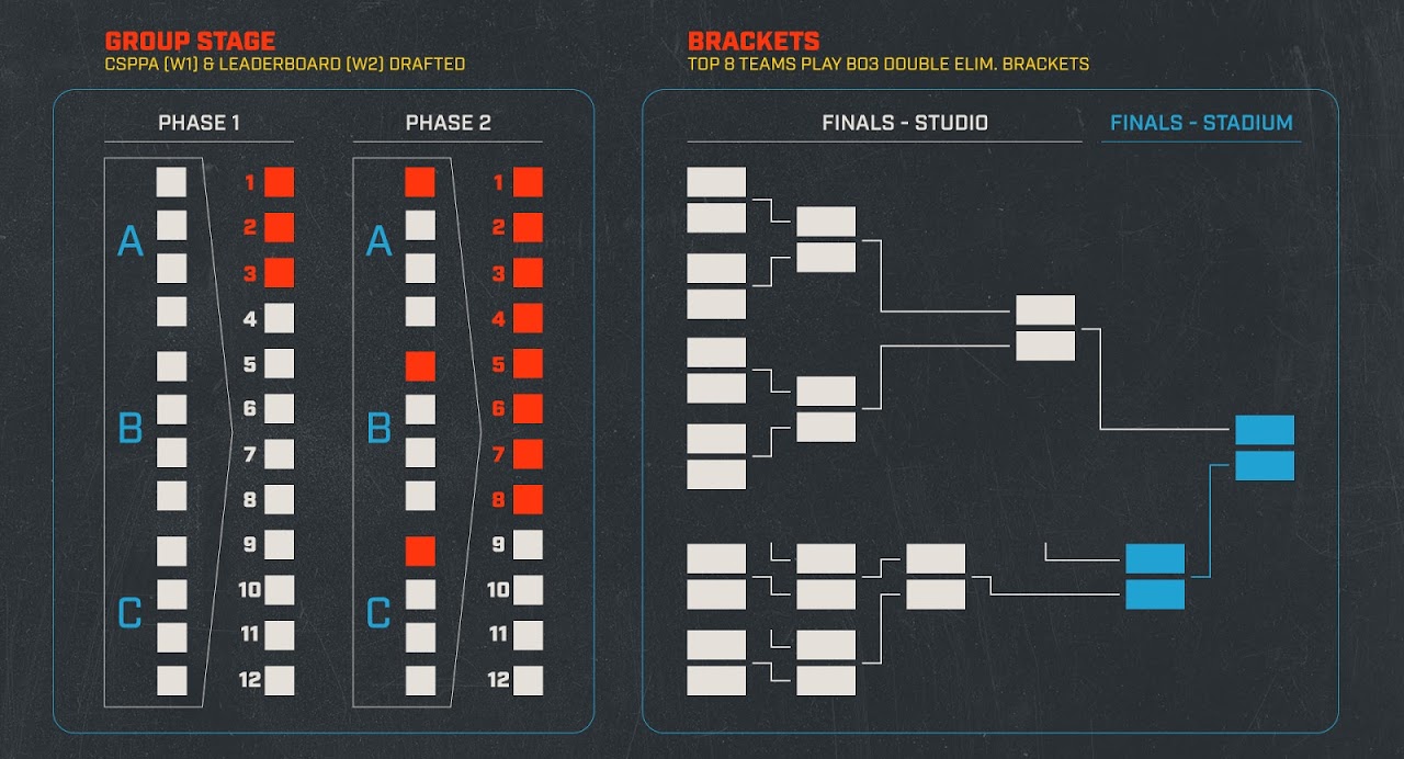 Il n'y aura donc pas d'élimination directe pour les participants jusqu'à la fin de la deuxième phase de la compétition où les huit meilleures formations s'immisceront dans un arbre à double élimination. Comme de nombreux événements, le COVID-19 a impacté les playoffs censés se dérouler à Stockholm pour au final s'orienter vers les studios à Los Angeles pour la totalitée de la compétition.