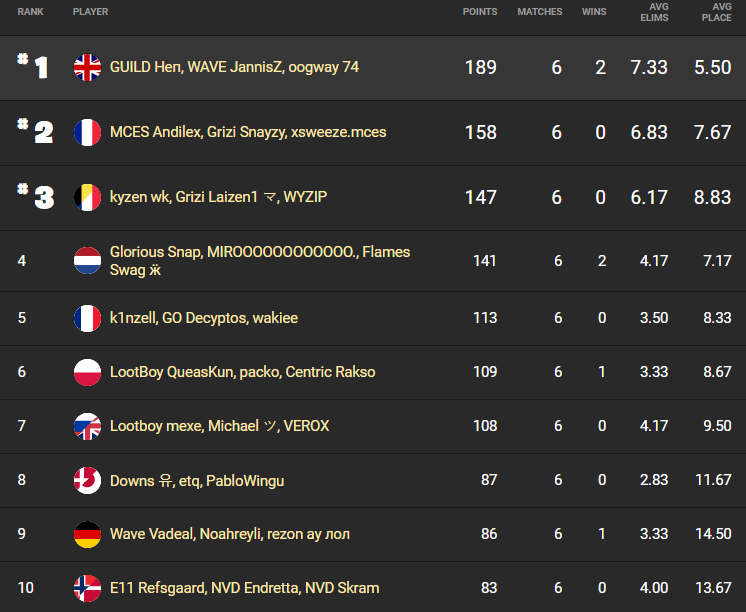 Six autres trios francophones n'ont pas réussi à terminer parmi les 10 premiers, mais ils se voient accorder leurs premiers points pour avoir atteint la manche 2, voie de qualification supplémentaire pour atteindre les finales ; après les trois semaines de qualifications, les 102 premières équipes de la Champion Series seront également qualifiées pour la demi-finale, pour un total de 132 équipes qualifiées par région.