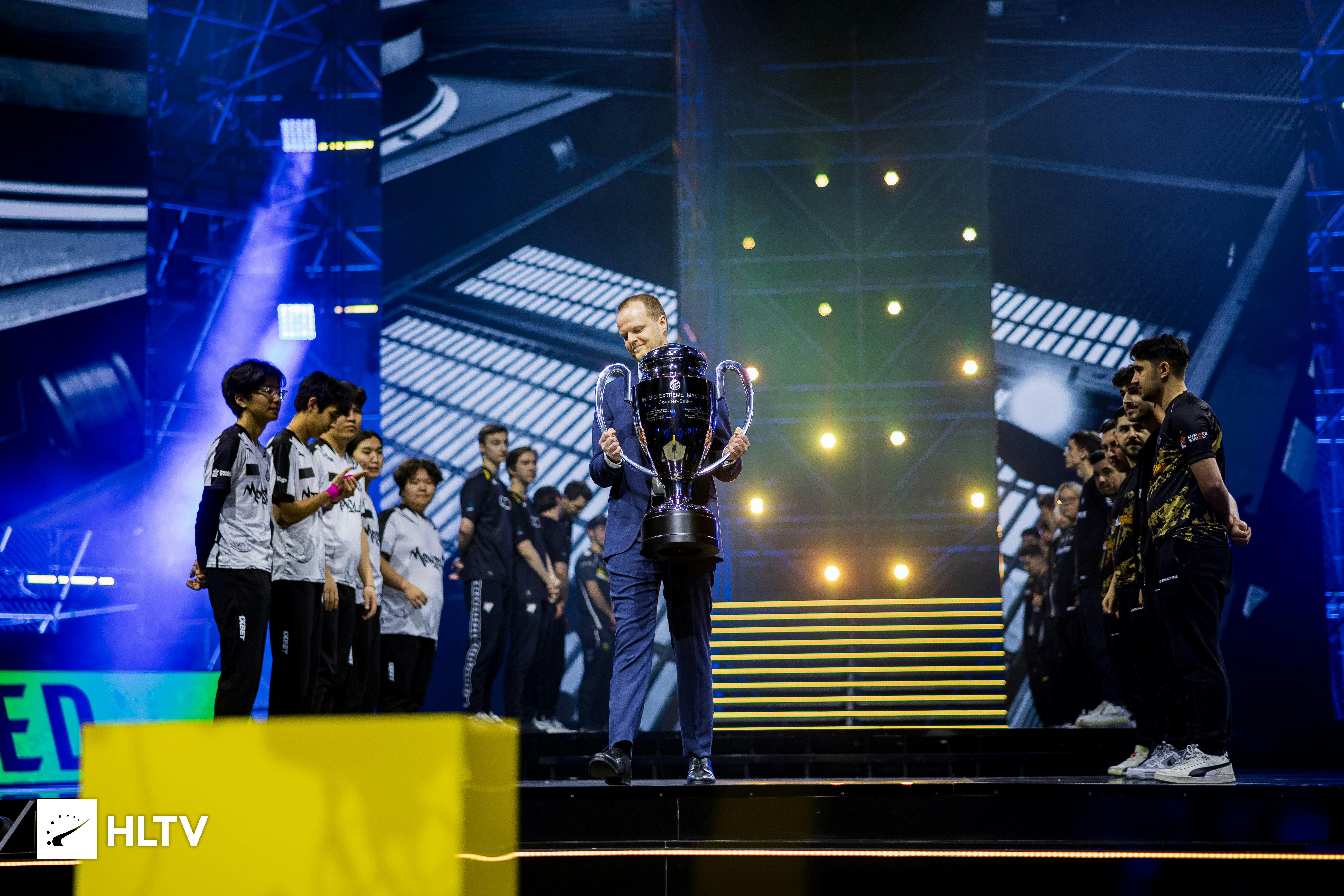 Xyp9X apportant le trophée dans la Spodek Arena, devant les joueurs qualifiés en quarts et demi-finales - (C) HLTV