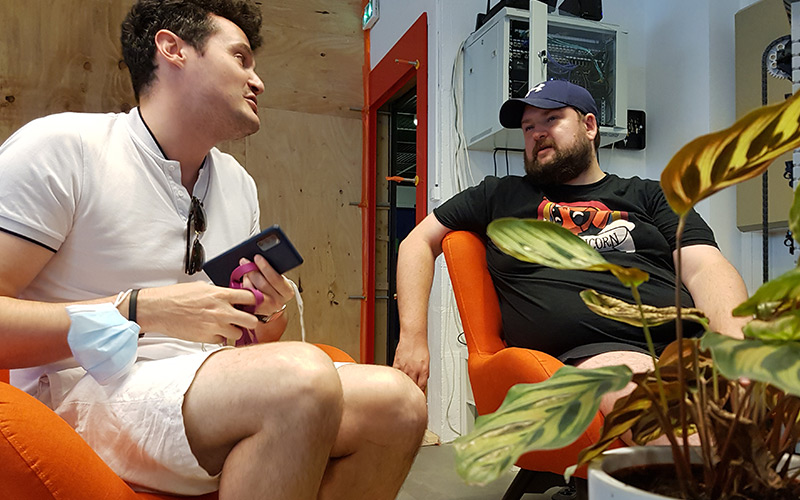 Clément (LeLfe) à gauche, Fred (Kaoru) à droite, faisant semblant de parler boulot