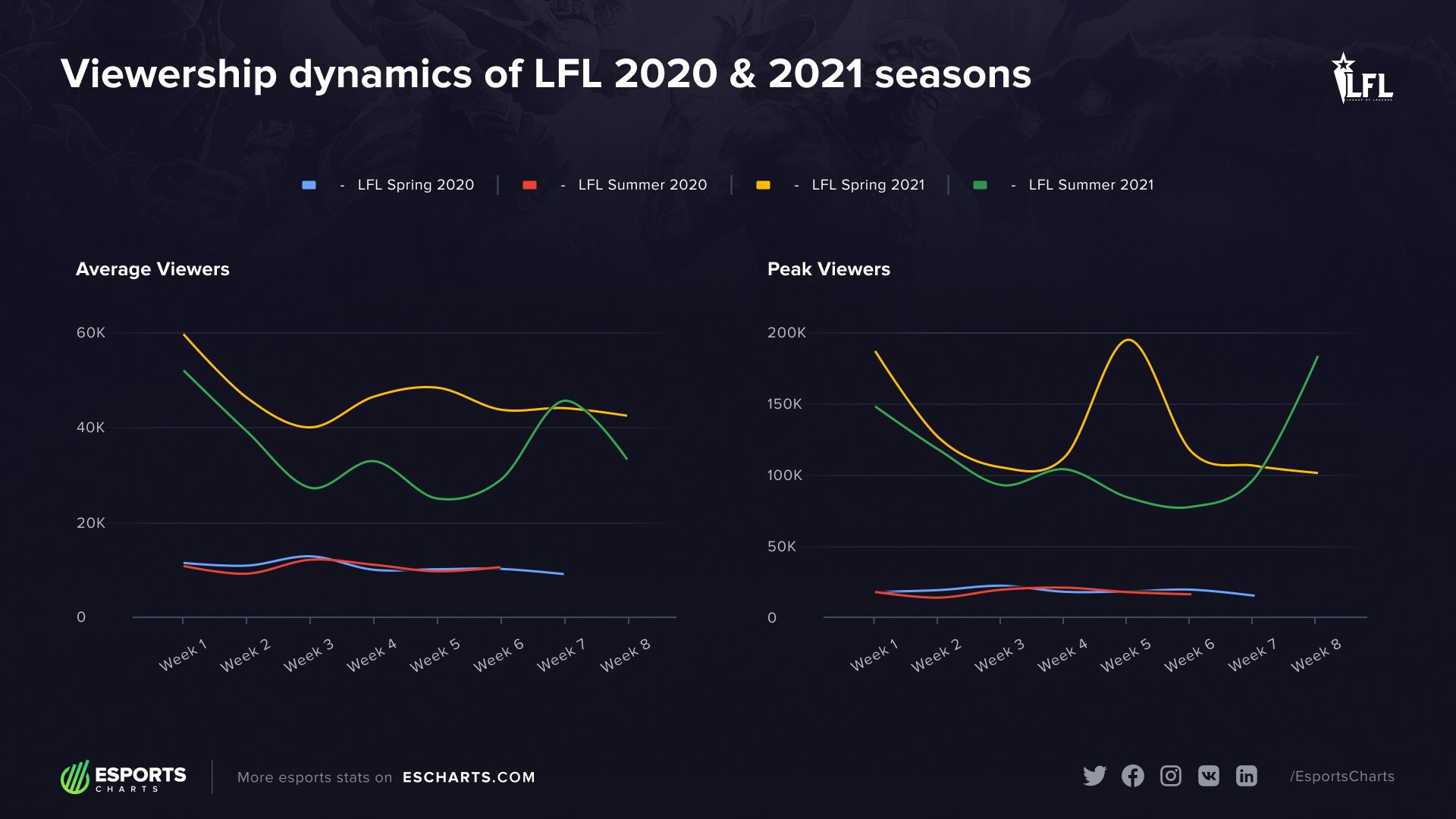 Les statistiques des deux dernières saisons fournies par Esports Charts montrent une augmentation du nombre de téléspectateurs aussi bien au niveau du Peak Viewers, que de l’Average Viewers. Alors que le pic le plus élevé de 2020, atteint au cours de la troisième semaine Spring Split, représentait environ 22 000 téléspectateurs simultanés, le pic le plus élevé de la saison 2021 était 8 fois plus élevé. Le Spring split a été le segment qui a attiré le plus de viewers avec un pic à 194 979 viewers, contre 183 709 pour le Summer Split.