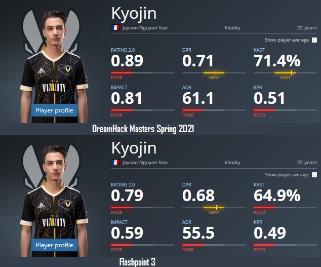 Et statistiquement parlant Jayson "Kyojin" Nguyen Van qui était une véritable machine à headshots avant d'intégrer l'équipe jaune et noir est très loin de ses standards. Avant d'arriver chez Vitality par exemple, son pourcentage de tirs en pleine tête en faisait l'un des cinq meilleurs dans ce domaine au niveau international, aujourd'hui il se place plus dans la moyenne avec une chute de plus de 8% de sa précision. Il est en effet passé de 63,9% en 2020 à 55,8% sur le Flashpoint 3, or c'était clairement l'un des points forts du joueur. Mais alors qu'est-ce qui a bien pu entraîner une telle baisse, mis à part le fait qu'il joue désormais face à des adversaires supérieurs ?