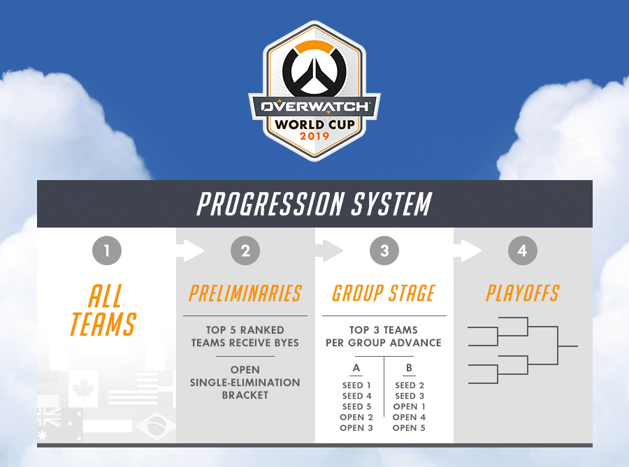 Cette année, avant le début des matchs, les pays seront classés selon un système de points pondérés basé sur leurs résultats finaux lors des trois précédentes coupes du monde d’Overwatch. Les points obtenus peuvent aller de 1 pour une participation aux 16e de finale à 10 pour une médaille d’or. Les points décernés pour les précédentes années seront pondérés de façon à privilégier les performances les plus récentes : 100 % pour 2018, 50 % pour 2017 et 25 % pour 2016. Les égalités entre deux pays seront départagées grâce aux résultats de l’année la plus récente, et si nécessaire, grâce aux résultats de leurs face-à-face. Les comités de compétition et les joueurs des 10 équipes les mieux classées participant à la BlizzCon verront l’intégralité de leurs frais de vol aller-retour, de transports routiers et d’hôtel pris en charge. Tous les autres pays admissibles qui confirmeront leur participation seront entièrement responsables de leurs frais de déplacement et verront une partie de leurs frais d’hôtel pris en charge.