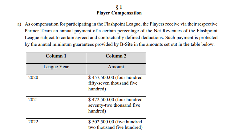 Les modèles actuels de partage des revenus qui prévalent dans CS:GO ont vu le jour en grande partie grâce à la pression exercée par FLASHPOINT lors des négociations d'intersaison 2020 avec le syndicat et ses représentants. Ces dernières années, la CSPPA a conclu des accords similaires avec ESL, BLAST et Dreamhack. Une partie du partage couvre divers flux de revenus comme les droits de diffusion, le sponsoring et les revenus des billets. Ce qui est unique à FLASHPOINT, c'est la compensation minimale garantie en plus d'un paiement annuel en pourcentage des revenus nets. Ce modèle a été discuté à plusieurs reprises par les cadres de FLASHPOINT, comme une structure plus lucrative et prometteuse par rapport aux accords d'ESL et de BLAST.