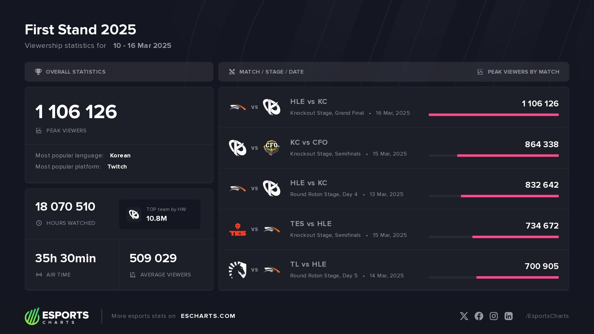 Le First Stand 2025, premier tournoi international de la saison, s'est conclu avec une très belle audience. Le match le plus suivi a été la grande finale entre Hanwha Life Esports et Karmine Corp, qui a attiré un pic de 1 106 126 spectateurs simultanés. Avec plus de 18 millions d’heures visionnées et une moyenne de 509 029 viewers, l’événement a confirmé son attrait, bien que des facteurs comme le décalage horaire et l’absence de certaines équipes phares aient possiblement limité son audience.