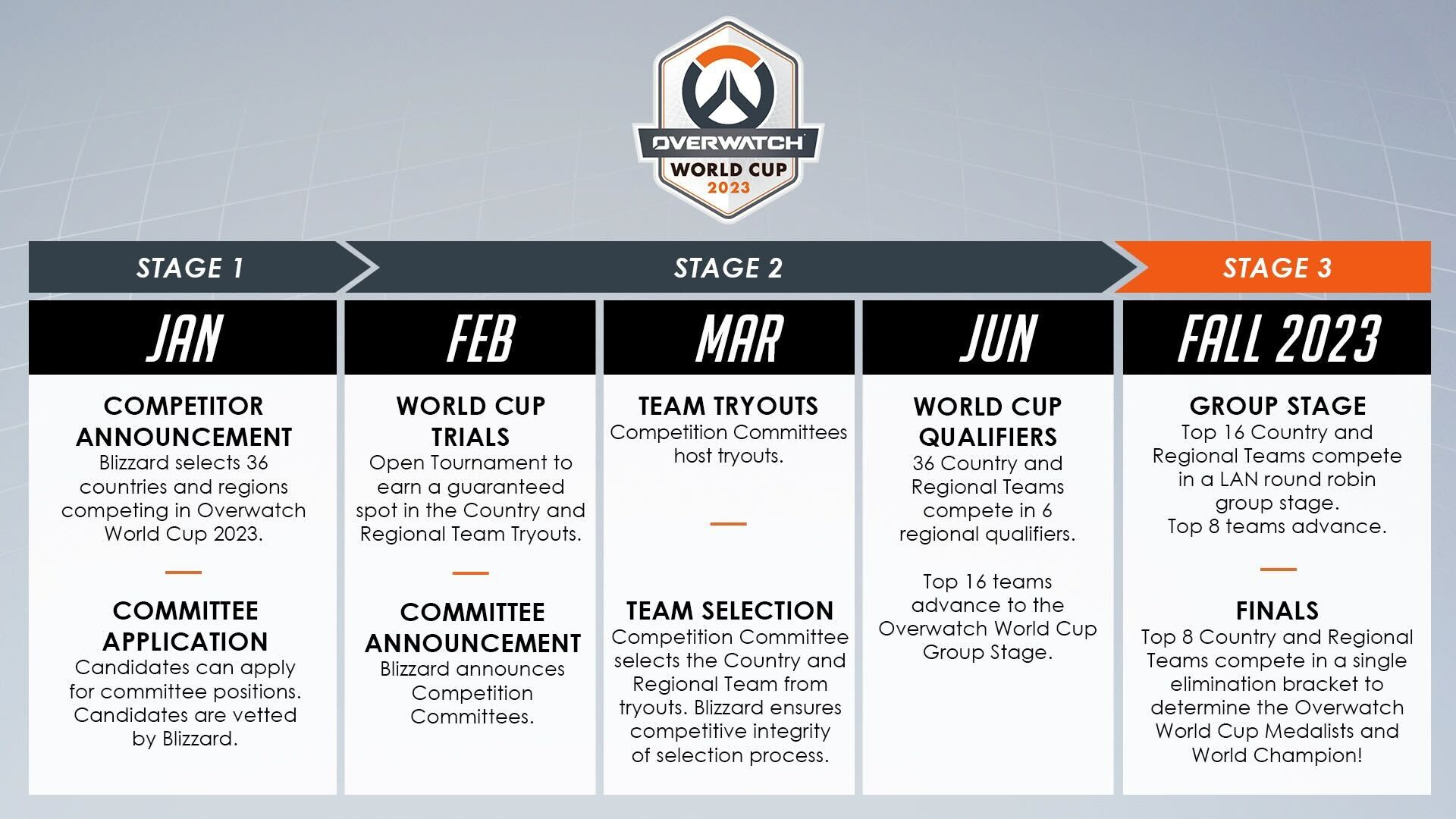 Le programme comprendra trois conférences, chacune avec deux groupes distincts de six pays et régions. Ces pays et régions ont été sélectionnés sur la base des données de population des joueurs d'Overwatch 2. En février, les candidatures aux comités de compétition commencent. De plus, chaque pays et région participant accueillera les épreuves de la Coupe du monde pendant trois week-ends en février (du 10 au 12 février, du 17 au 19 février et du 24 au 26 février). Les comités de compétition seront chargés d'organiser des essais supplémentaires pour les équipes en mars et de finaliser une équipe de sept joueurs en avril.