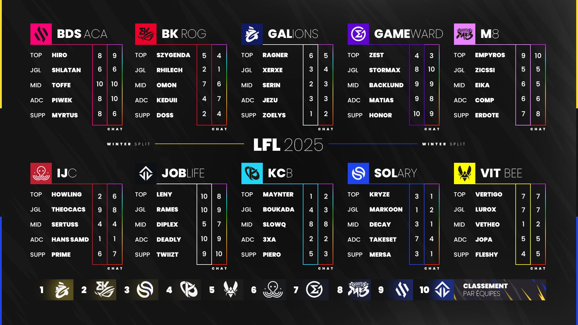 À quelques jours du coup d'envoi du Winter Split saison 2025 de la LFL, les membres du crew Solary se sont prêtés au jeu des prédictions pour ce segment compétitif. Selon eux, le top 3 du prochain Split serait composé des Galions (anciennement Team GO), de BK ROG et de Solary, des équipes qu’ils considèrent comme les favorites pour dominer la saison et pour se faire une place sur le podium.