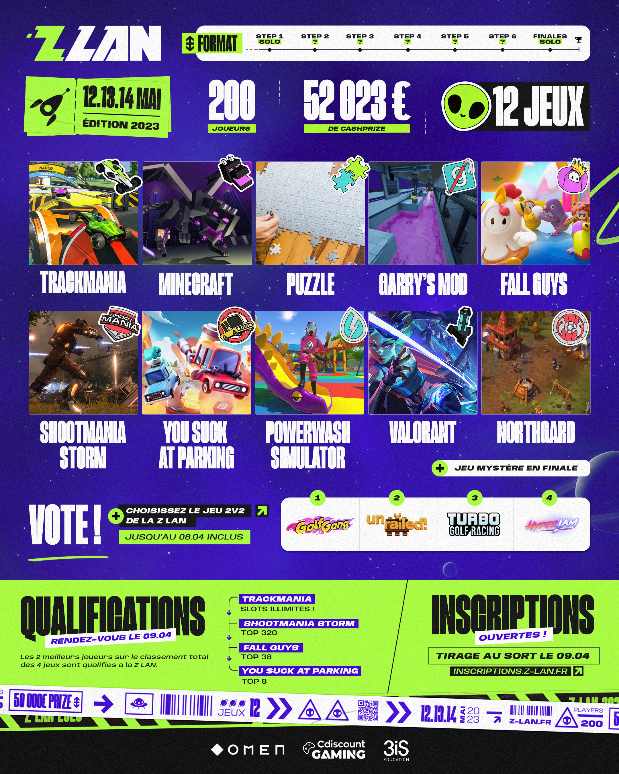 Pour rappel, pendant 3 jours de compétition, 200 joueurs s’affronteront sur 12 jeux différents pour tenter de remporter les 50 023 € en jeu. La Z LAN étant conçue avant tout comme une émission, ce nouveau format solo obligera les joueurs à adapter leur stratégie afin de former des alliances qui pourront être défaites au fil de la compétition.