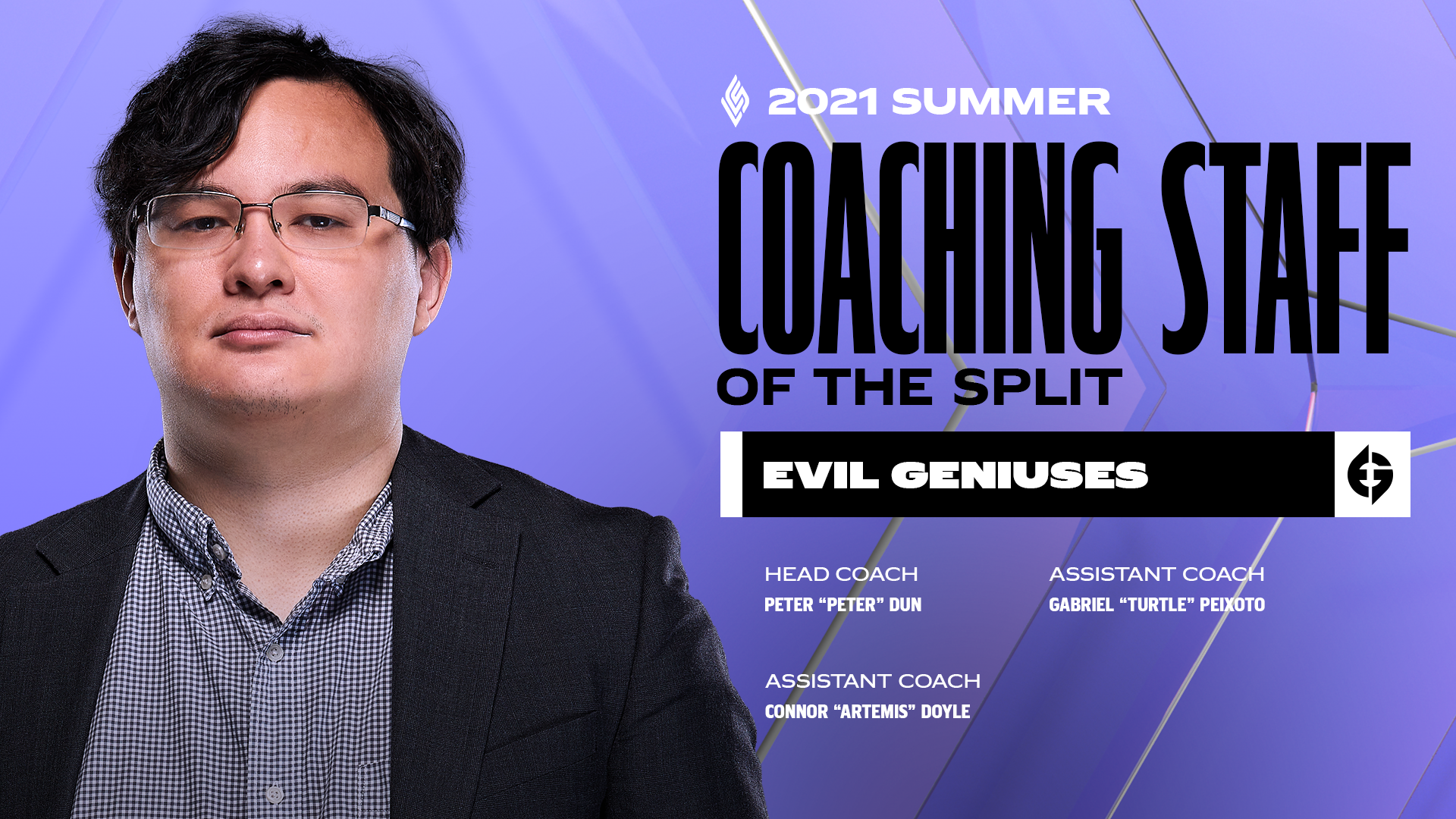 Le titre de meilleur Coaching Staff de cette saison estivale a été décerné au personnel d’encadrement de l’équipe Evil Geniuses, à savoir l'équipe gérée par Peter Dun en tant qu'entraineur en chef, et dans laquelle nous retrouvons notamment Gabriel "Turtle" Peixoto et Connor "Artemis" Doyle au poste d'entraineur adjoint. Le Coaching Staff d'Evil Geniuses succède ainsi à Cloud9 qui avait remporté le prix au Spring Split. Evil Geniuses a terminé la saison régulière à la 3e place au classement général, rendant une fiche de 28 victoires pour 17 défaites ; elle va disputer son premier match des éliminatoires dès ce soir, affrontant Dignitas, équipe arrivée 6e. Son objectif, au-delà du titre qui semble promis à Team Solomid ou 100 Thieves, est de terminer dans le top 3 et ainsi se qualifier pour le Championnat du monde 2021 de League of Legends.