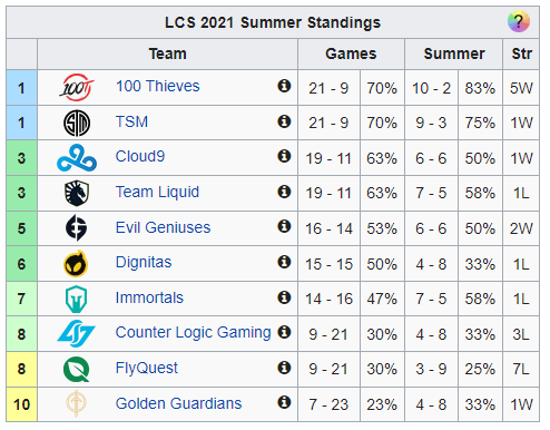 Retrouvez le programme, le classement et les résultats des LCS Summer Split saison 2021, le championnat auquel participent les meilleures équipes nord-américaines du circuit.
