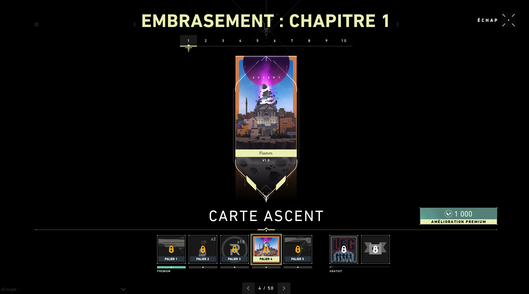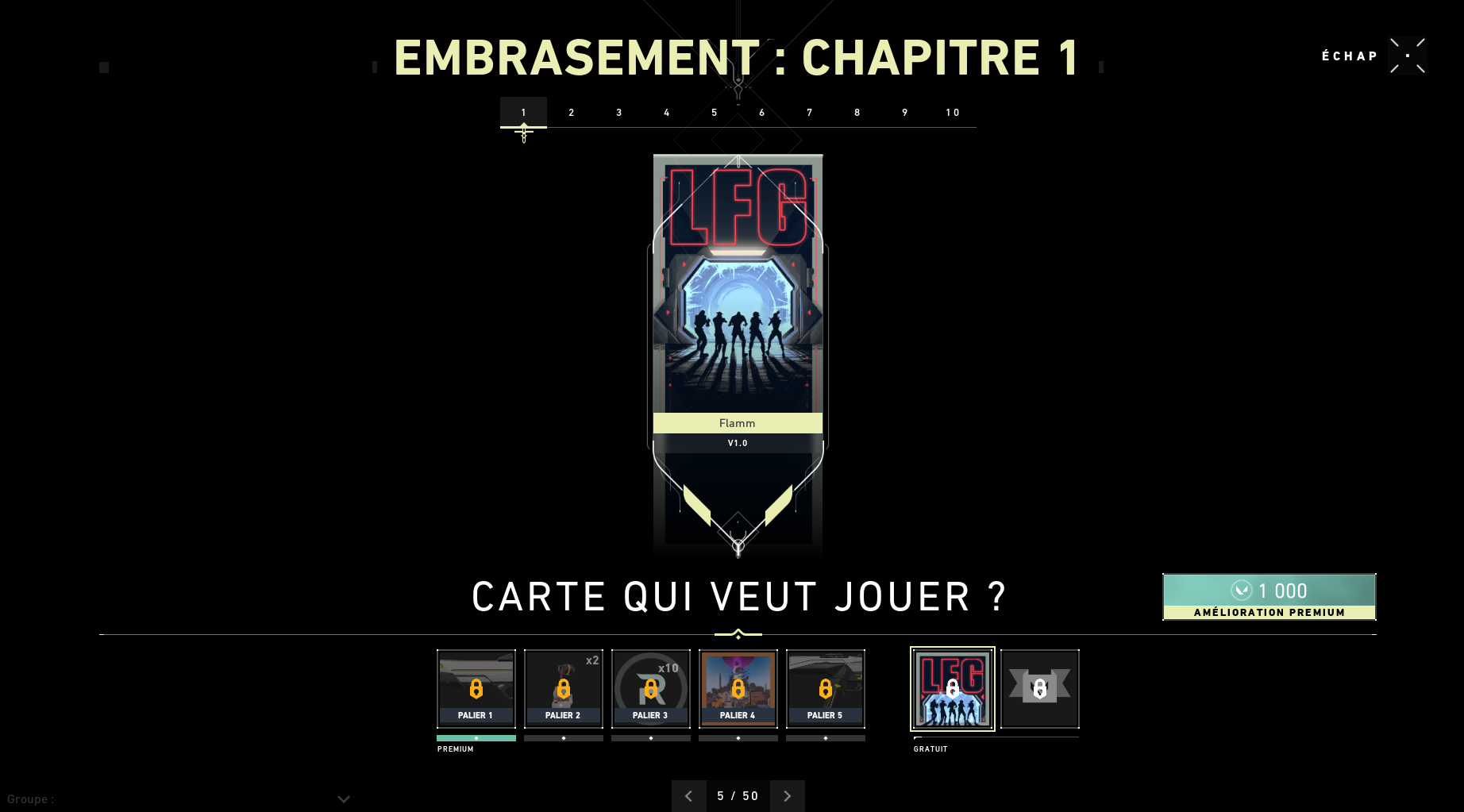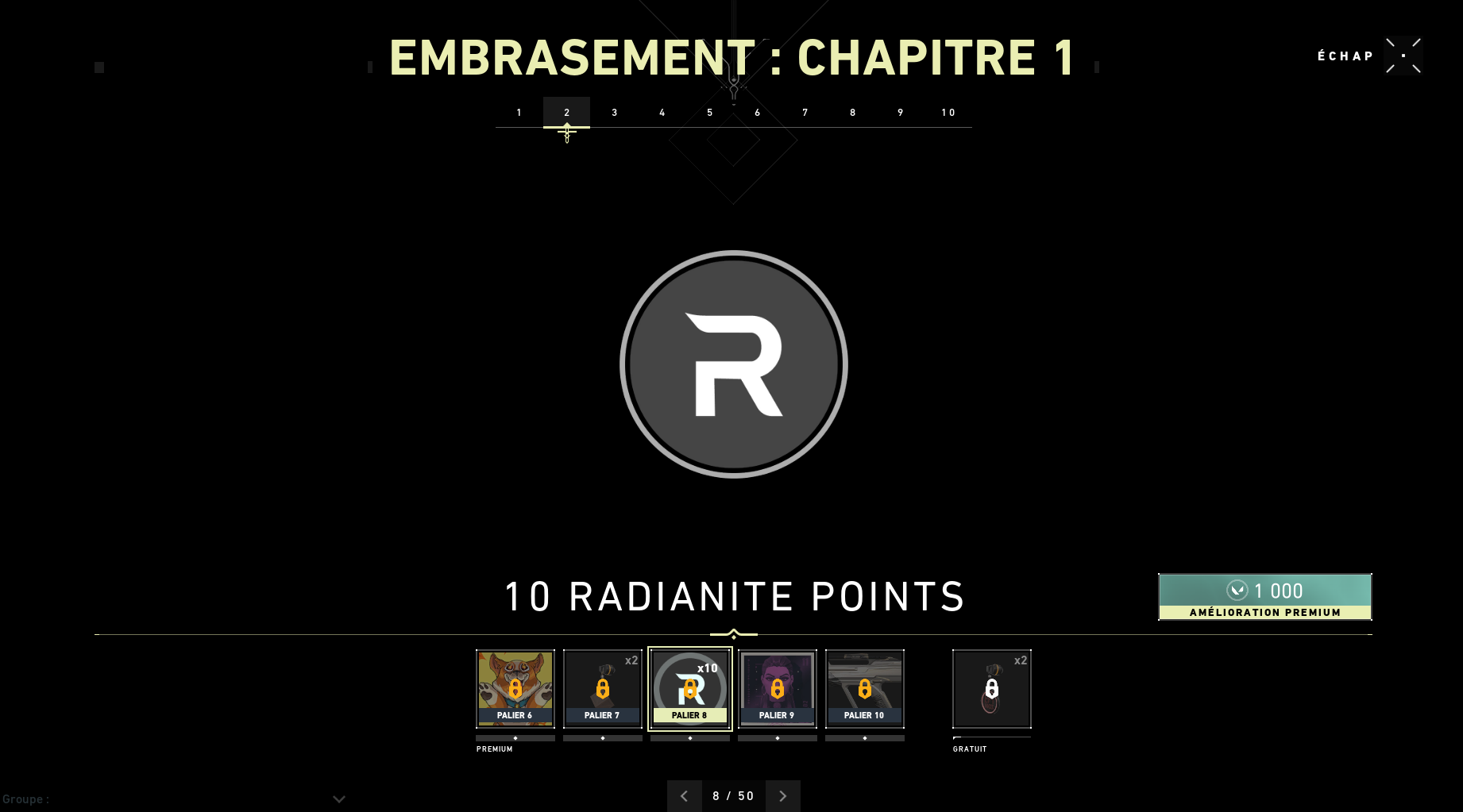 L'acte I du passe de combat de VALORANT sera composé de 50 paliers ouverts pour une durée limitée avec une voie gratuite et une voie premium. Par défaut, notre passe de combat est gratuit et ouvert à quiconque se connecte pendant sa période de validité. Il sera actif en même temps que le contrat de personnage que vous avez choisi et progressera simultanément en fonction de l'XP que vous gagnez dans les missions et les parties.