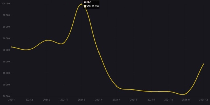 Grâce à un autre site d'analyse des données, cette fois l'Américain Leetify, on peut connaître un peu plus dans le détail les informations concernant CSGO. En effet sur les 3 747 971 comptes bannis en 2021 on découvre que 600 000 l'ont été alors que les joueurs étaient présents sur les serveurs du FPS de Valve, soit 16% des concernés. On constate également que depuis le passage en payant du mode Prime, et par conséquent de l'obtention des skins et du classement, le nombre de joueurs bannis est en forte baisse. De janvier à avril 2020 on était sur une moyenne mensuelle de 65 000, ensuite il y a eu la vague du mois de mai avec ses 100 000 comptes touchés, puis le passage en payant du mode Prime à partir du mois de juin et depuis le nombre de joueurs bannis est passé à une moyenne de 23 000 mensuels. Toutefois une nouvelle mise à jour interne a eu lieu le mois dernier et a permis de doubler ce nombre pour arriver pratiquement à 50 000 comptes bannis.
