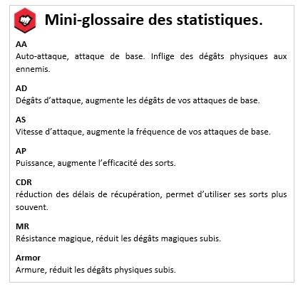 Différentes statistiques figurent sur tous les champions : vitesse de déplacement, vie, quantité de mana, vitesse d’attaque, dégâts d’attaque, puissance, résistance magique et armure, chances de coup critique, réduction des délais de récupération, vol de vie. Bien sûr, il existe d’autres statistiques, mais nous n’évoquerons ici que les statistiques principales nécessaires à la compréhension globale du jeu.