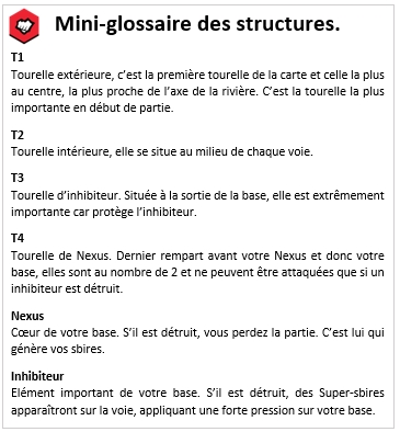 Sur chaque voie « fixe » (top/mid/bot) se situent des tourelles qui servent à défendre la base. Si vous attaquez un champion dans la portée d'attaque d'une tourelle, elle vous attaquera. Si vous l’attaquez sans sbires pour prendre l'aggro, c'est à dire l'attention dirigée de la tourelle sur sa cible, elle vous attaquera aussi.