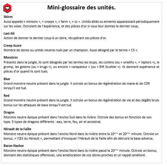 Pour effectuer un point glossaire, ces sbires peuvent être désignés par les termes « minions », « creeps » mais aussi « farm ». L’abréviation « CS », quant à elle, vient de l’expression « Creep Score » et désigne le nombre de sbires tués par un champion.