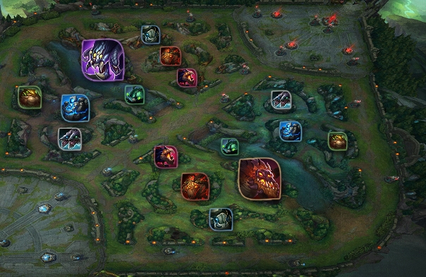 Au nord, le Baron Nashor ou le Hérault de la Faille, et au sud, le Dragon.