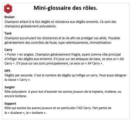 Faisons un récapitulatif rapide : nous avons quatre classes réparties sur des voies, et une classe SVF (« Sans Voie Fixe »). Le top encaisse les dégâts, le mid et l’adc infligent les dégâts, le support assiste ses alliés dans un rôle de soutien, et le jungler assiste lui aussi ses alliés, mais dans un rôle de tank ou de dégâts. Vous avez suivi ?
