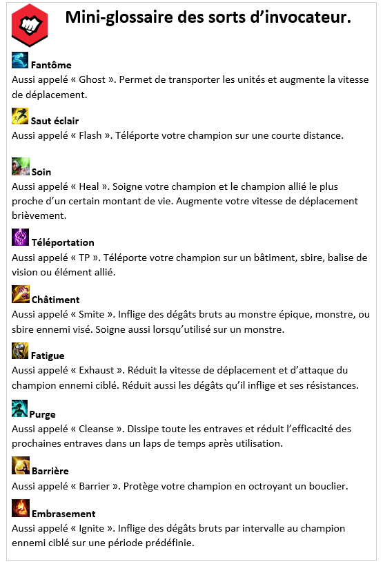 Saut Éclair ». Il s'agit d'un déplacement instantané sur une certaine distance, permettant d’échapper à un ennemi, ou de rattraper une proie s’enfuyant. Ensuite, les sorts dépendent des classes. Les « toplaners » vont généralement récupérer une «