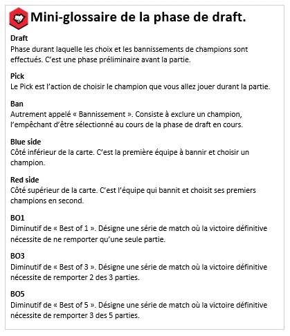 Une chose est à savoir. En partie compétitive, il ne peut y avoir deux fois le même champion dans chaque partie. Il faut donc procéder par avance à la sélection des champions. De plus, certains champions sont jugés trop puissants, trop gênants par les équipes : celles-ci décident donc de ne pas permettre que le champion soit choisi : il est banni. Actuellement, chaque équipe possède 5 bannissements. Ainsi, on a donc à chaque partie 10 champions bannis et 10 champions choisis : bienvenue dans la phase de sélection des champions, aussi appelée la « phase de draft ».