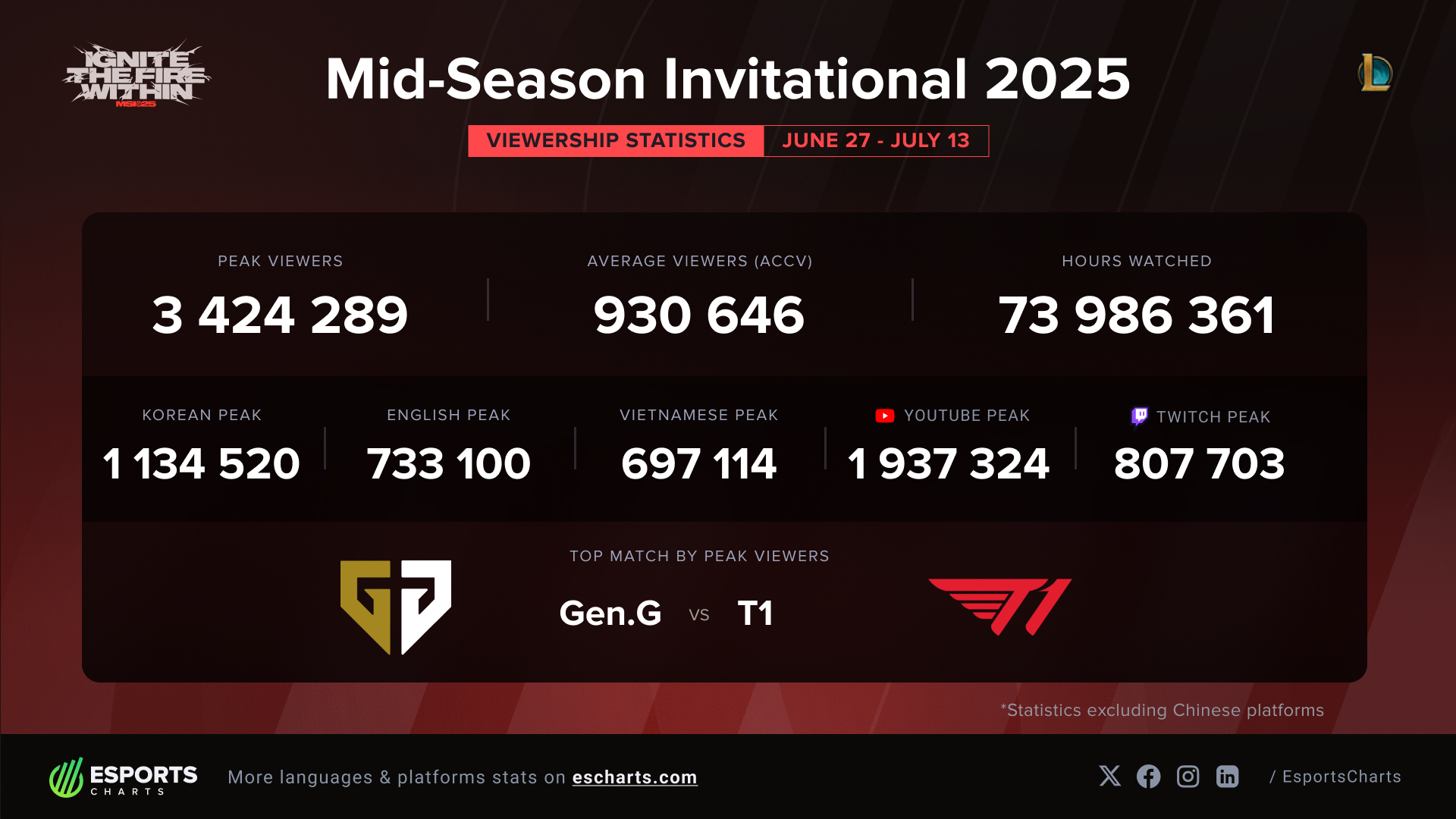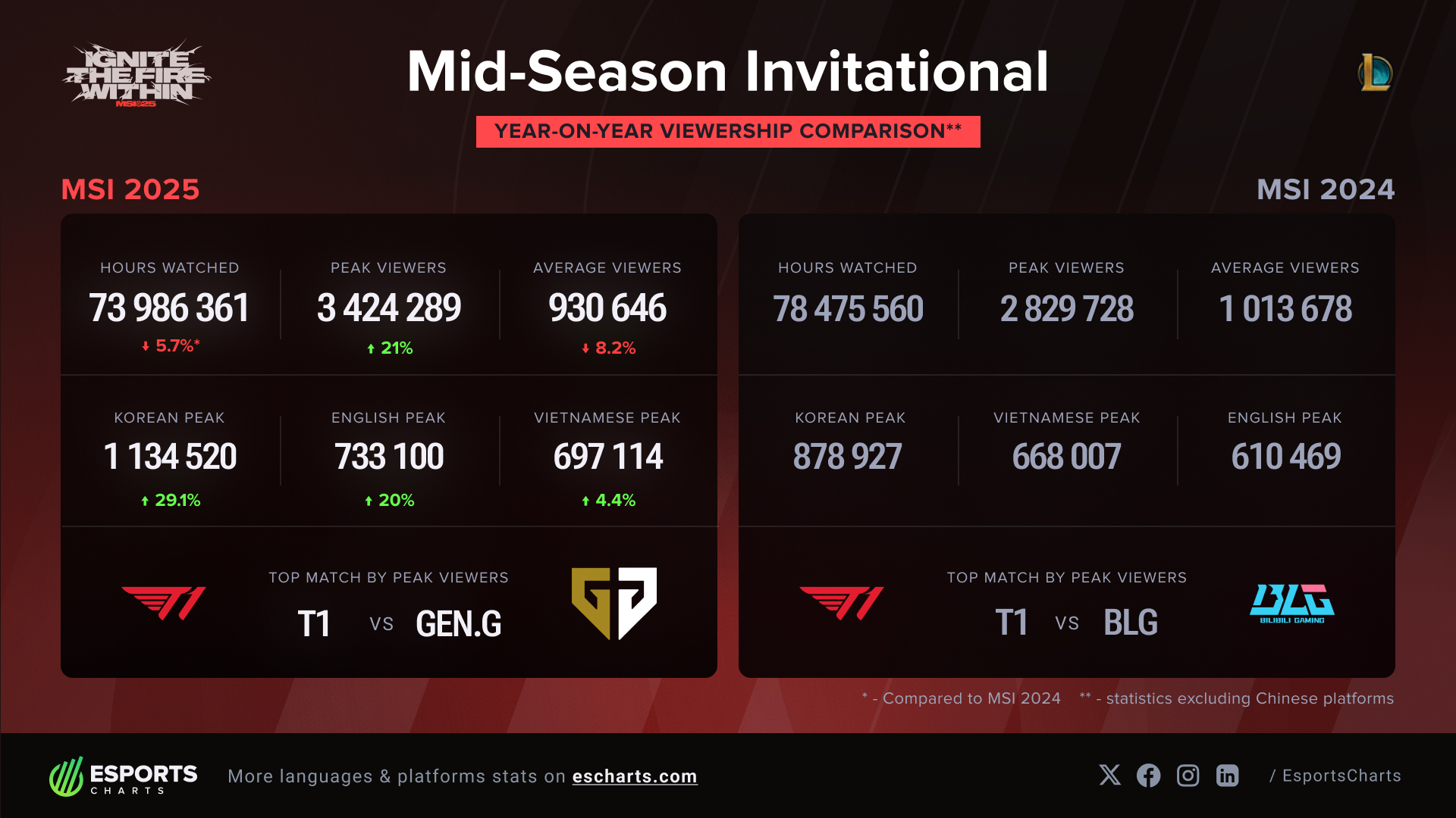 Avec plus de 3,4 millions de spectateurs simultanés lors de la finale entre Gen.G et T1, le Mid-Season Invitational 2025 devient le tournoi MSI le plus suivi à ce jour. Une édition marquée par une finale serrée et une progression constante de l’audience tout au long de l'événement.