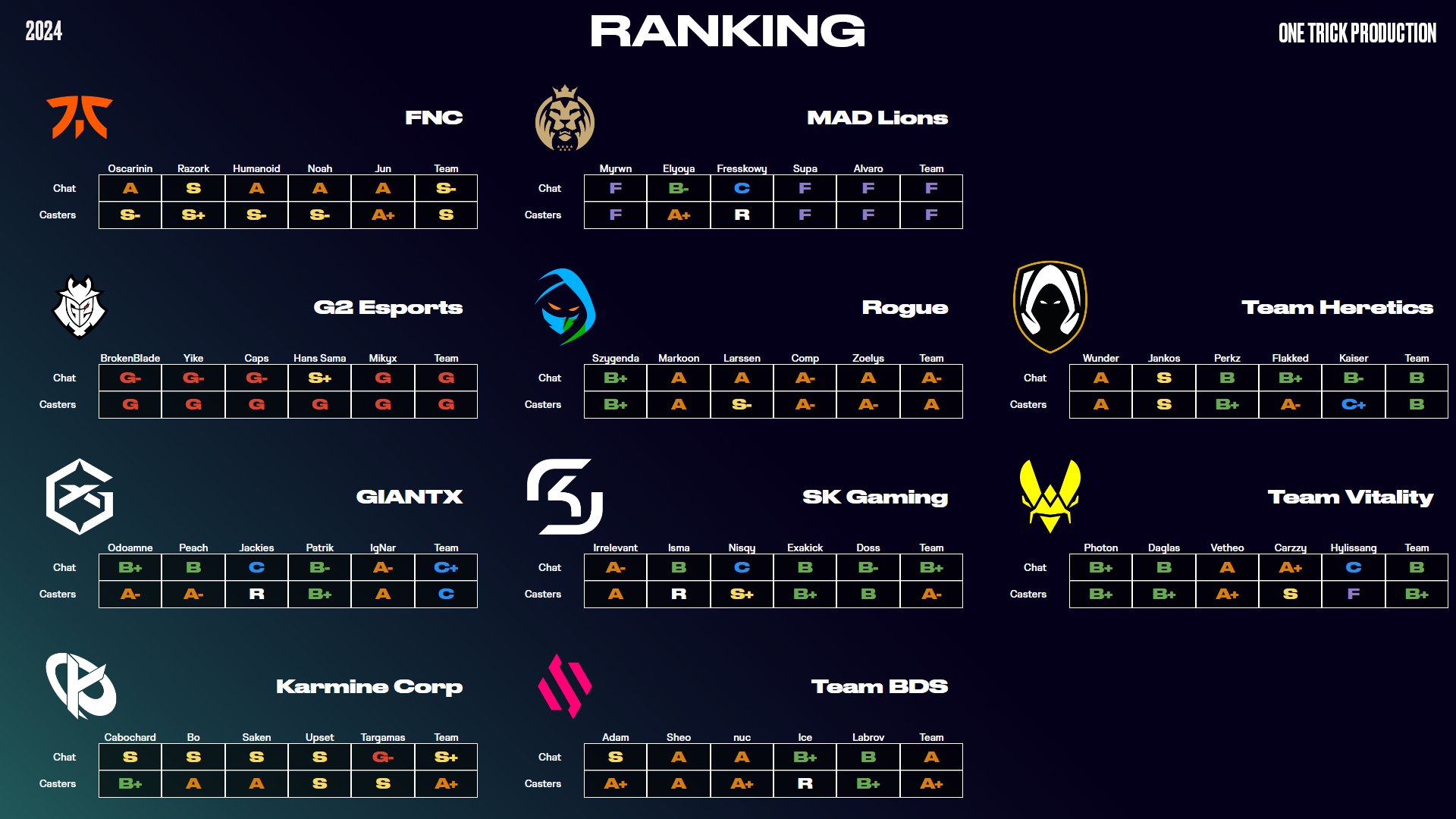 Le LEC Winter Split saison 2024 va commencer dans quelques heures et comme avant chaque début de segment, le crew des commentateurs et analystes d'OTP a procédé à son Power Ranking des joueurs et équipes européens.