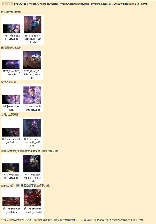 Sur la plateforme Reddit, un sujet chaud est sorti il y a peu, des petits malins ont trouvé des fichiers révélant 5 nouvelles unités qui pourraient bien être prochainement intégrées au mode de jeu Teamfight Tactics. Si l’information est à prendre avec des pincettes, voici tout de même les heureux élus potentiels : Nidalee, Gnar, Janna, Morgana et Kog'Maw. Des champions qui ne sont pas totalement nouveaux, car ils sont tous apparus dans l’un des deux sets précédents.