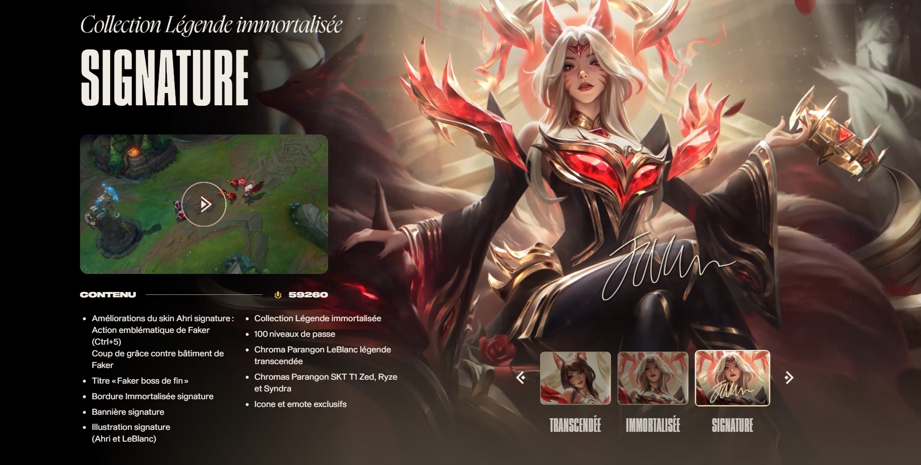 Faker, souvent considéré comme le plus grand joueur de League of Legends de tous les temps, se voit honoré par Riot Games à travers une série de skins commémoratifs pour célébrer son intronisation dans le LoL Esports Hall of Legends. La collection inclut notamment des chromas pour ses skins T1 Worlds (Ryze, Syndra, Zed), des améliorations pour le skin Ahri, un titre exclusif, des signatures de Faker sur les splash arts, une animation unique et d’autres récompenses. Ce pack prestigieux est tout de même proposé au prix de 59 260 RP, soit environ 500€, faisant de ce pack le bundle le plus cher mis en vente par Riot Games sur League of Legends. Bien évidemment, il existe plusieurs niveaux de contenu que vous pouvez acheter en ce qui concerne les nouveaux skins "Risen Legend Faker" avec un premier prix à 5430 RP (environ 47€) et un prix intermédiaire à 32430 RP (environ 282€), mais il vous manquera beaucoup d'items par rapport au pack "Signature".
